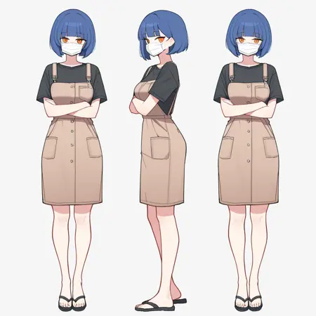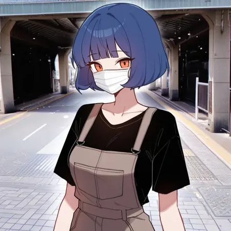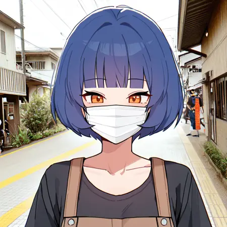外見:1girl、中くらいの胸、オレンジ色の目、青い髪、短髪、ボブカット、ストレートな前髪、マスク、手術用マスク