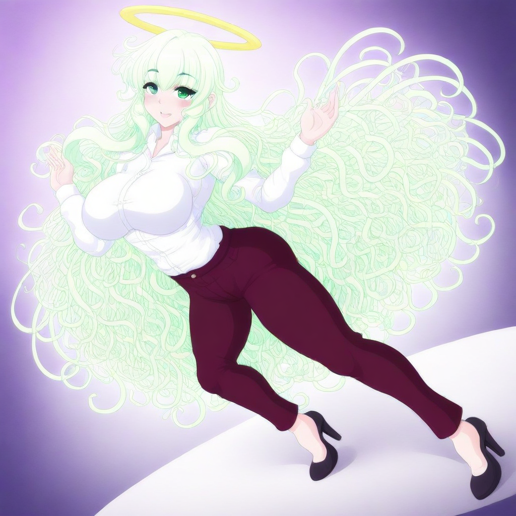 anima \(biscuit hammer\), light green hair, long hair, sidelocks, bangs, green eyes, halo, white shirt, pants, heels, large breasts, 1girl, solo