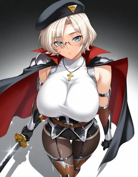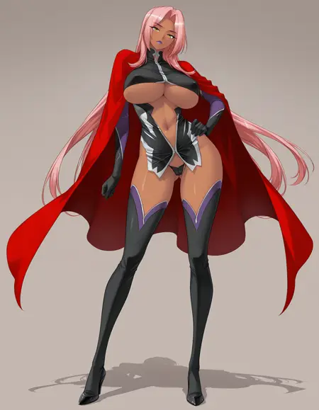 mai_tm_Ingrid,mature_female,dark-skinned_female,very_long_hair,pink_hair,yellow_eyes,purple_lips,mole_under_mouth,large_breasts,turtleneck,underboob,center_opening,elbow_gloves,black_thighhighs,black_footwear,high_heels,red_cape