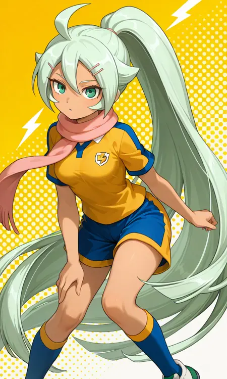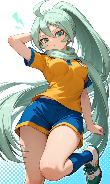 만토(이나즈마 일레븐), 연한 녹색 머리카락, 녹색 눈, 비현실적으로 매우 긴 머리, 매우 긴 머리, 매우 긴 꼬리, 무릎까지 닿음, 앞머리 왼쪽에 분홍색 클립 두 개, 앞머리, 목에 감긴 한 가닥의 머리카락, 스카프처럼 스타일링, 앞머리 왼쪽 하단에 분홍색 머리클립 세 개, 중간 크기의 가슴, 허벅지
