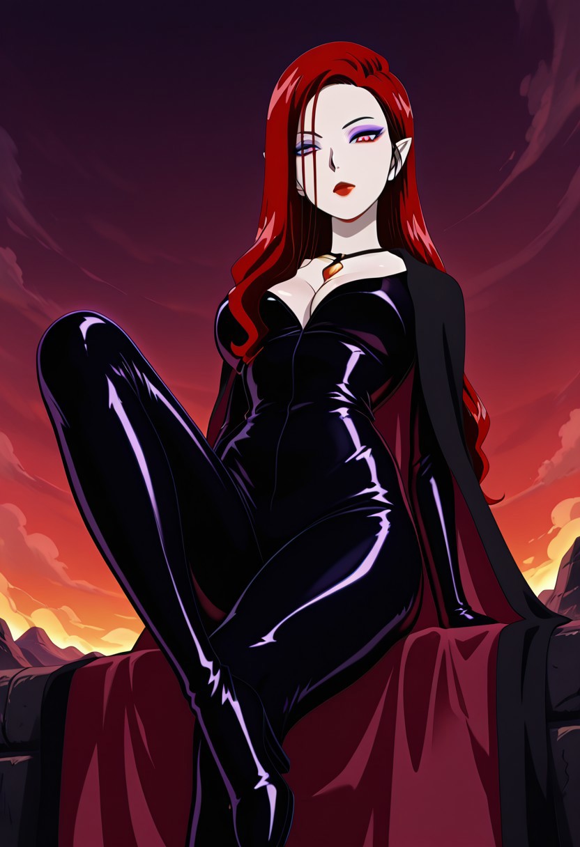 poisoly, 1 female, red hair, long hairstyle, eyeshadow, red eyes, red lips,