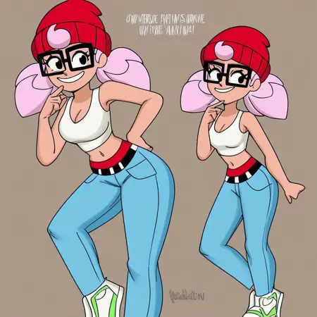 bsJanet_trycky, 1girl, pink hair, twintails, red beanie, black-framed eyewear, white top, crop top, midriff, navel, blue jeans, white sneakers