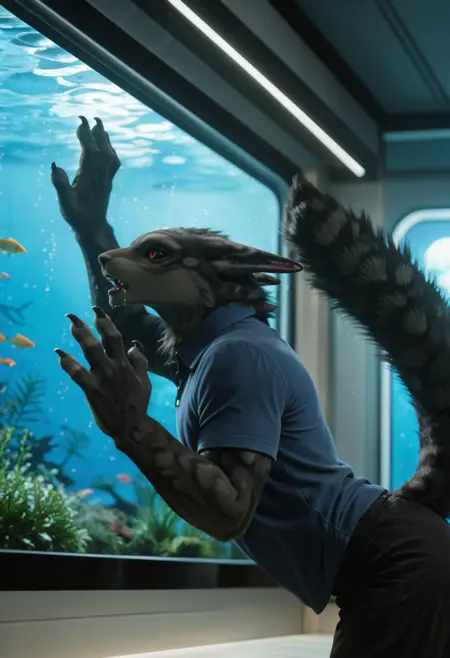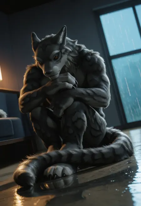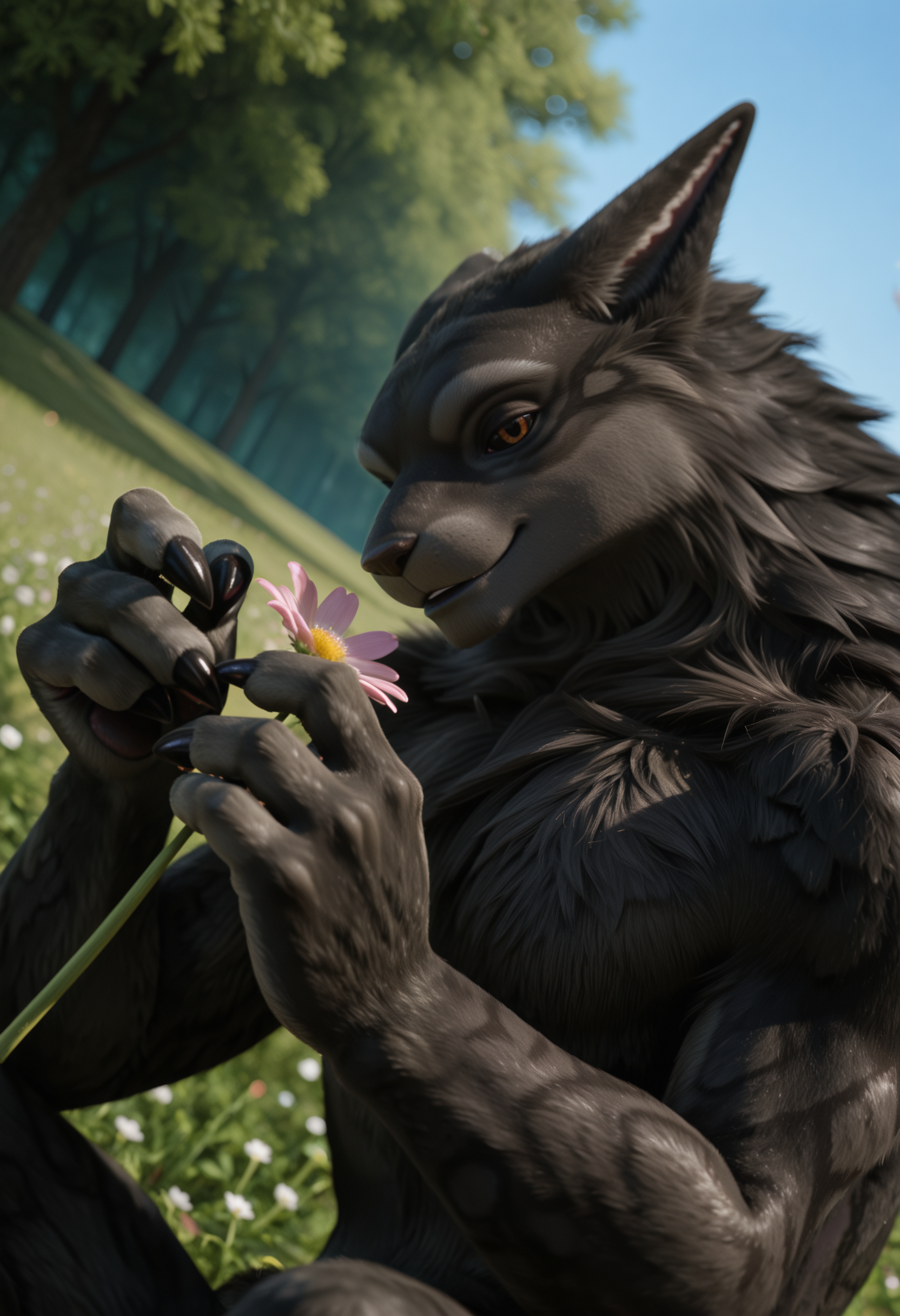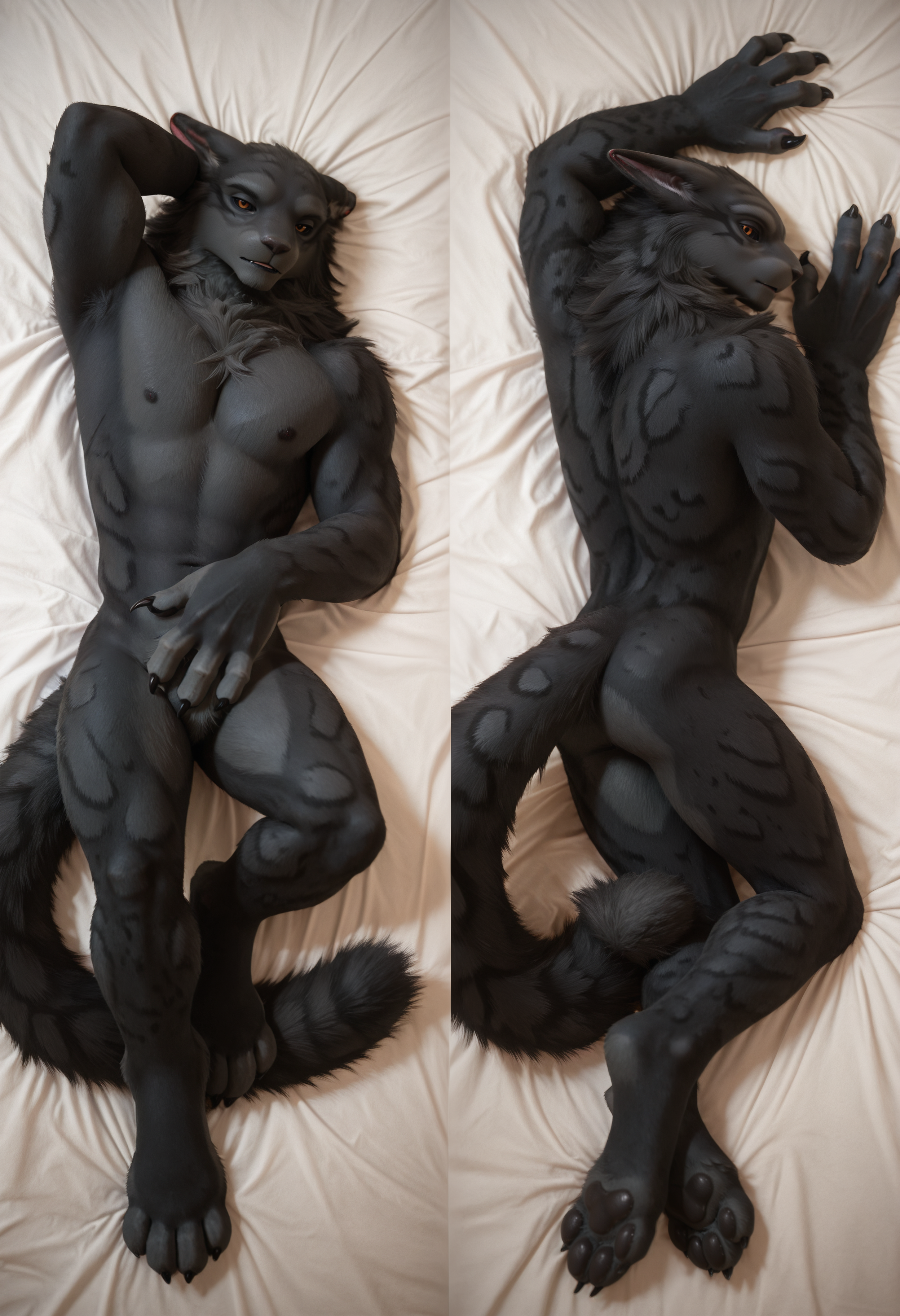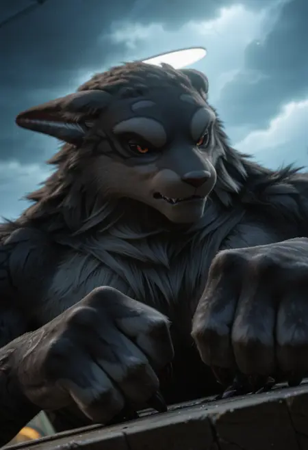 bfct_rua1dr1, feline, mammal, anthro, werefelid, werefeline, felid, male, fur, furry, furry male, hi res, tail, 1boy, claws, body fur, solo, male focus, black fur, looking at viewver, black sclera, 4fingers