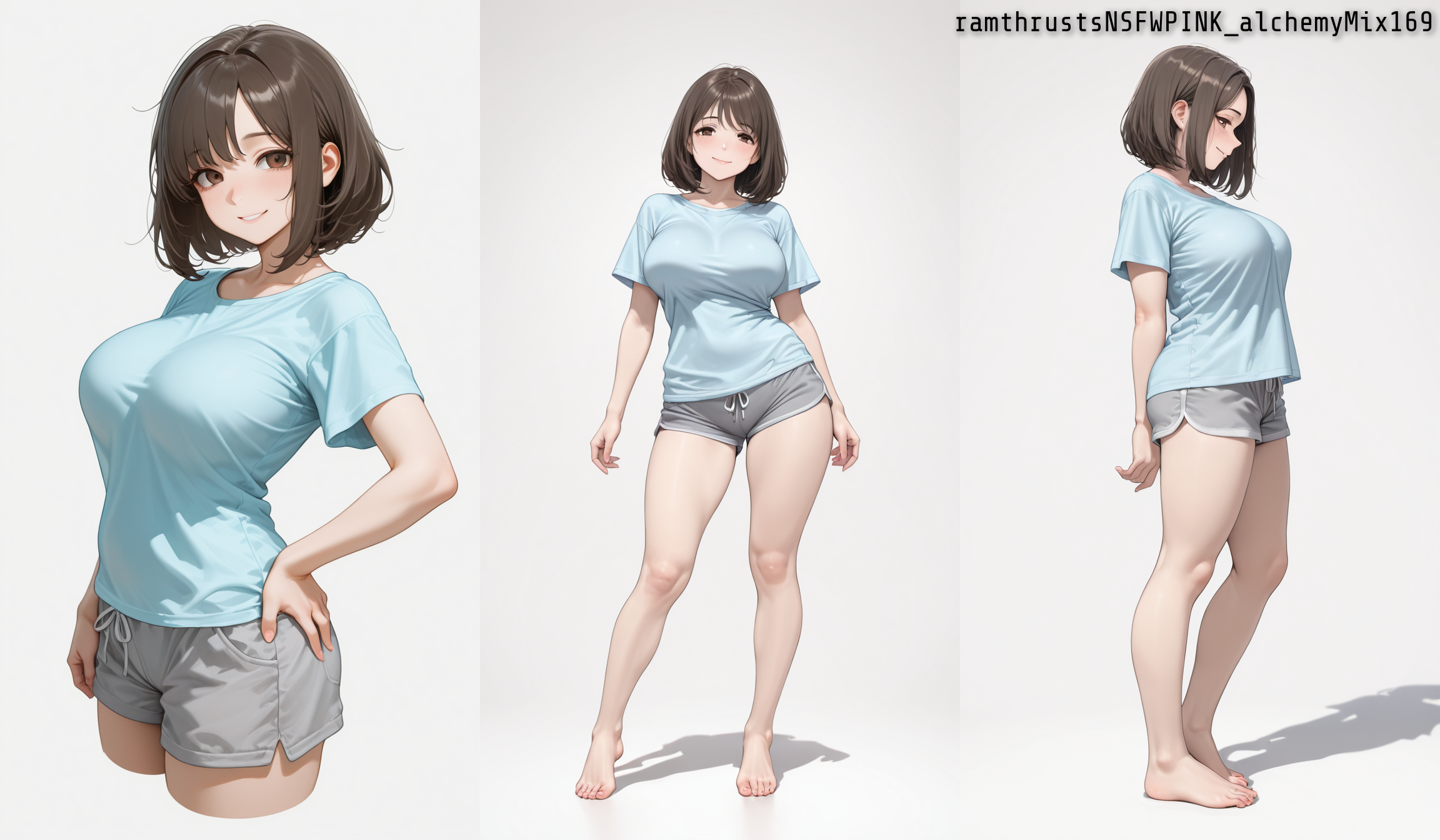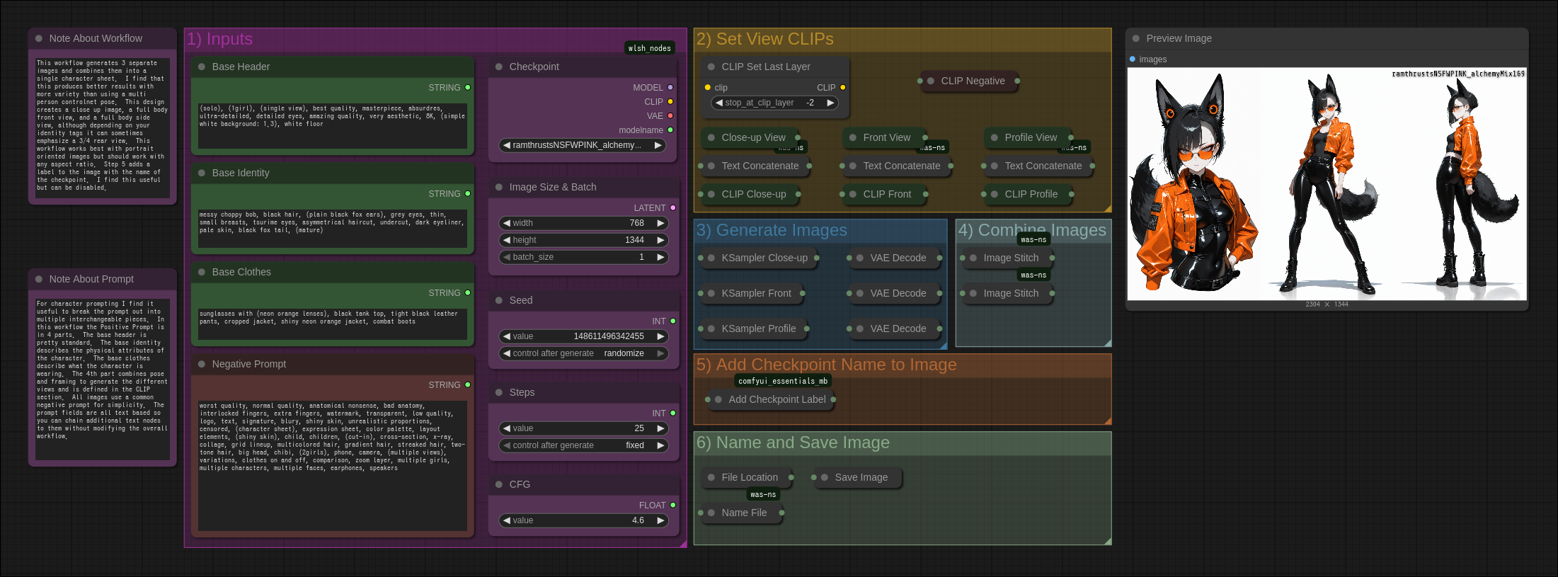 세 가지 표준 시점(근경, 정면, 측면)에서 캐릭터를 생성하기 위한 깔끔하고 모듈화된 ComfyUI 워크플로우.