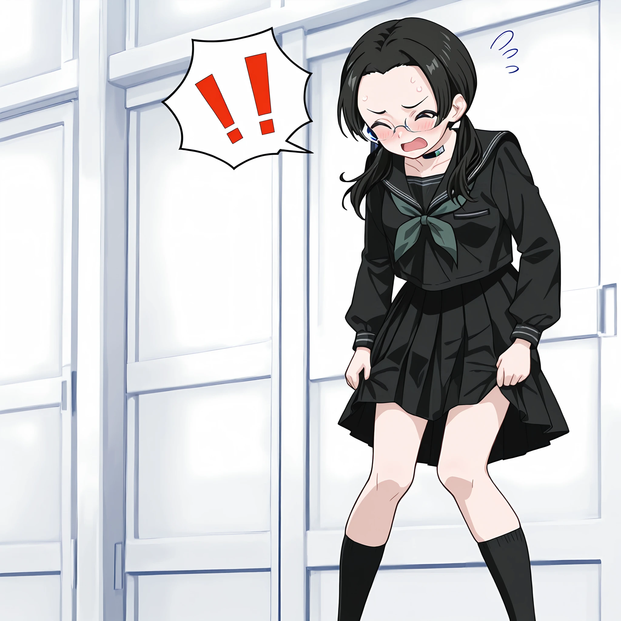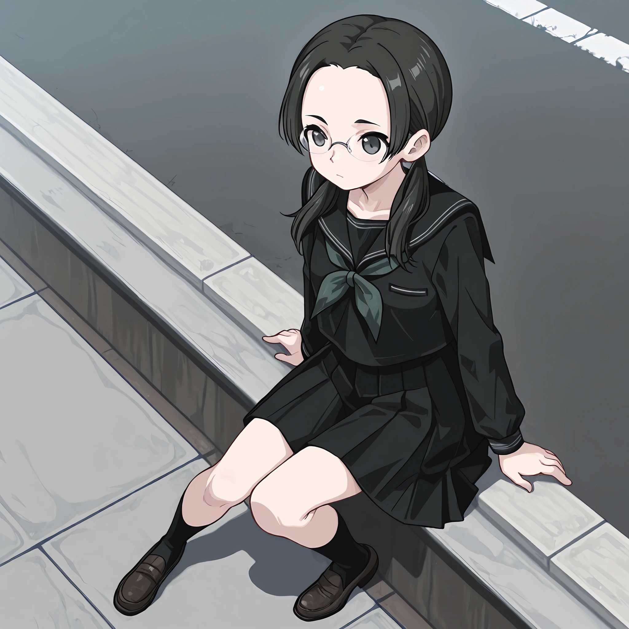 Usual outfit : black serafuku, black shirt, black skirt, green neckerchief, sailor collar, white socks, loafers,