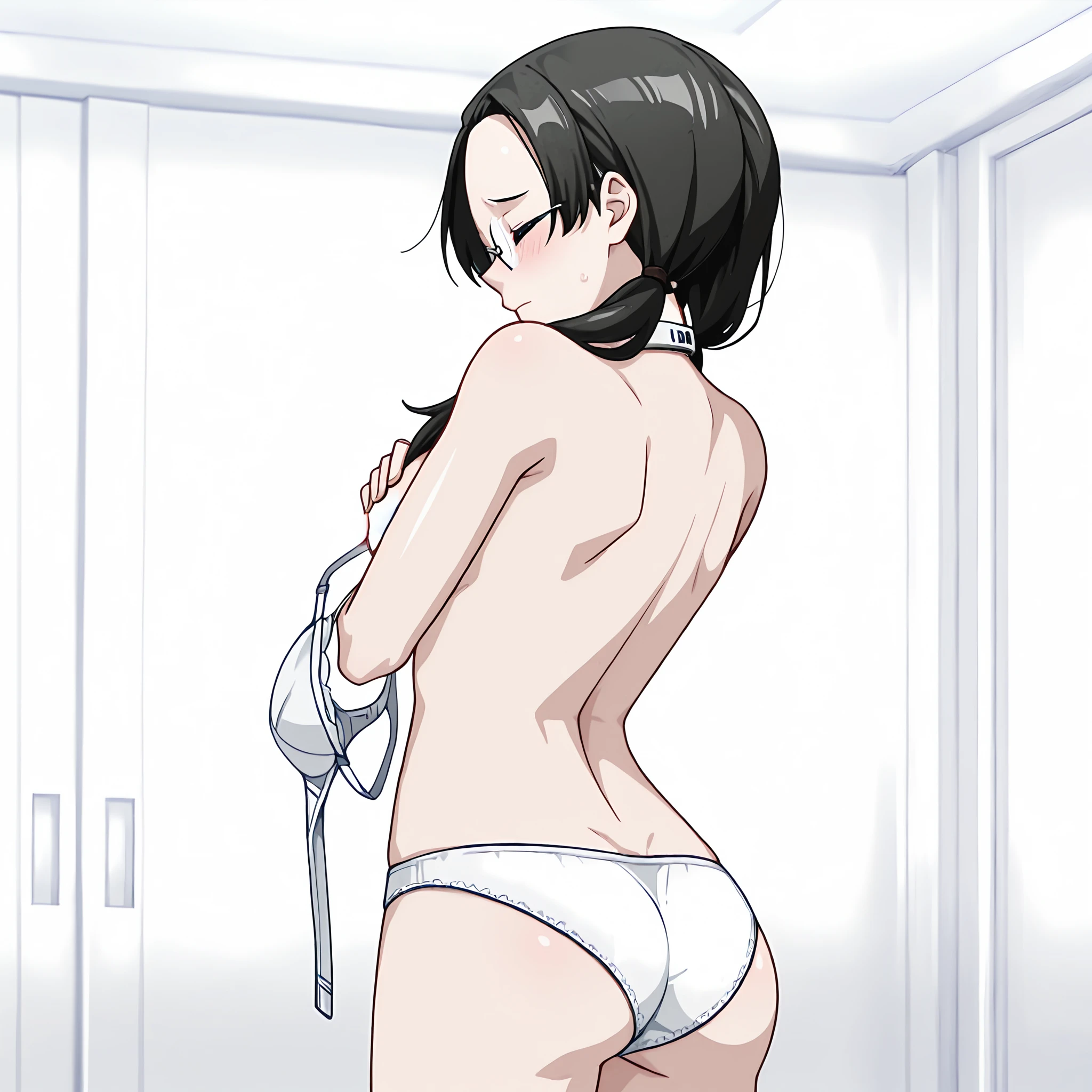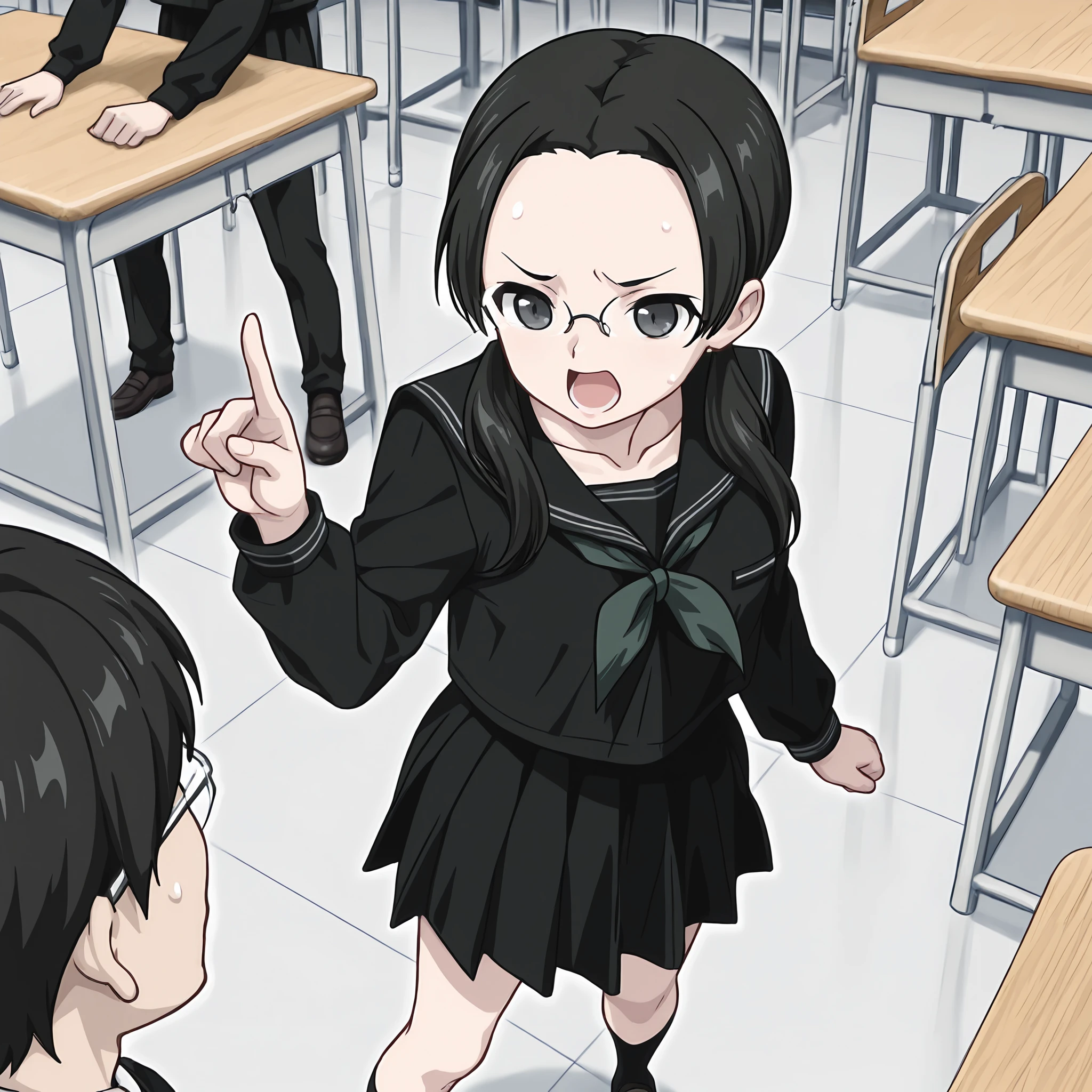 General appearance : AndouMiyako, long hair, black hair, low twintails, black eyes, glasses,