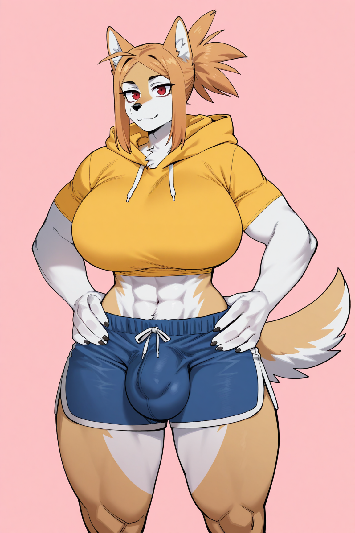 by kissxmaker, jina choi (kissxmaker), furry, furry female, anthro, animal ears, animal nose, snout, domestic dog, canine, orange fur, white fur, body fur, multicolored fur, orange hair, long hair, sidelocks, ponytail, red eyes, gynomorph, intersex, huge breasts, tail, muscular female, 1girl, solo, short sleeves, hood down, navel, abs, medium shorts, drawstring, multicolored shorts, bulge, detailed bulge, claws, standing, hands on hips, smile, looking at viewer, simple background, light pink background