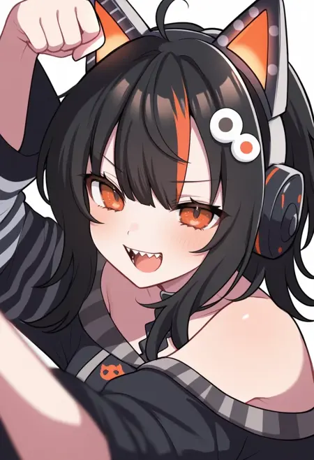 sharp_teeth, cat_ear_headphones, striped_thighhighs, single_thighhigh,
