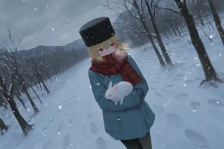> 白髪で赤い目を持つ美しいアニメの少女、複雑なドレスを着たシーン。 artist:konya_karasue