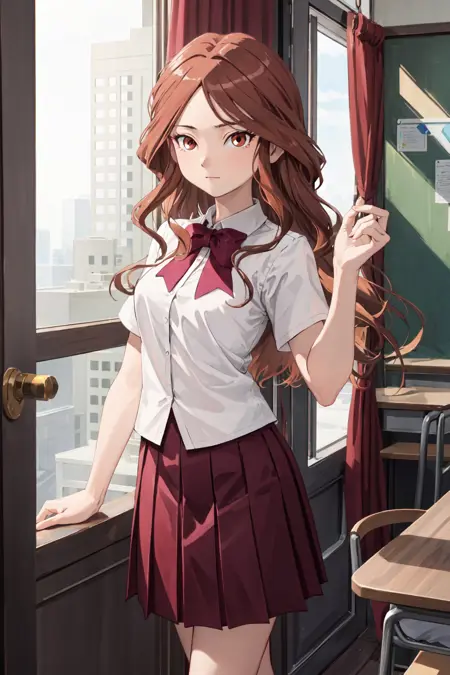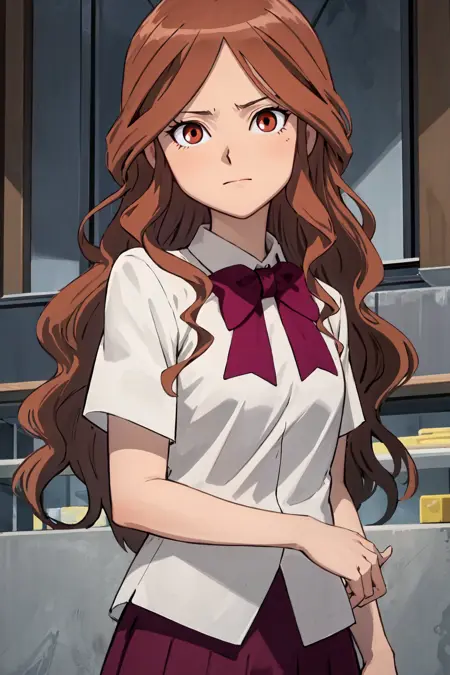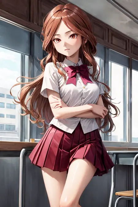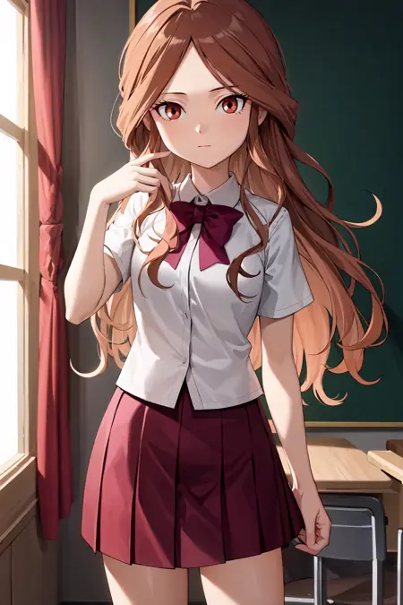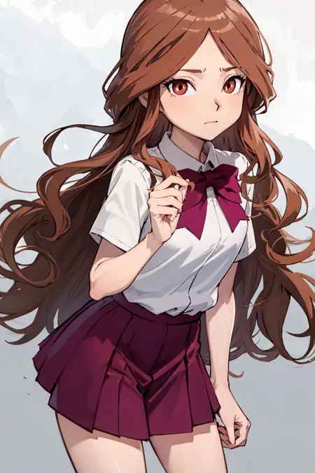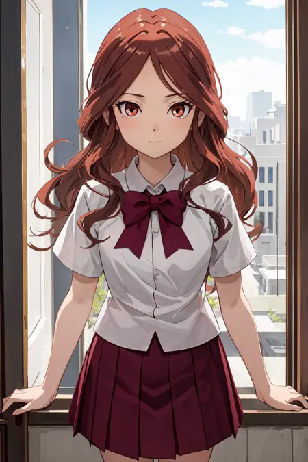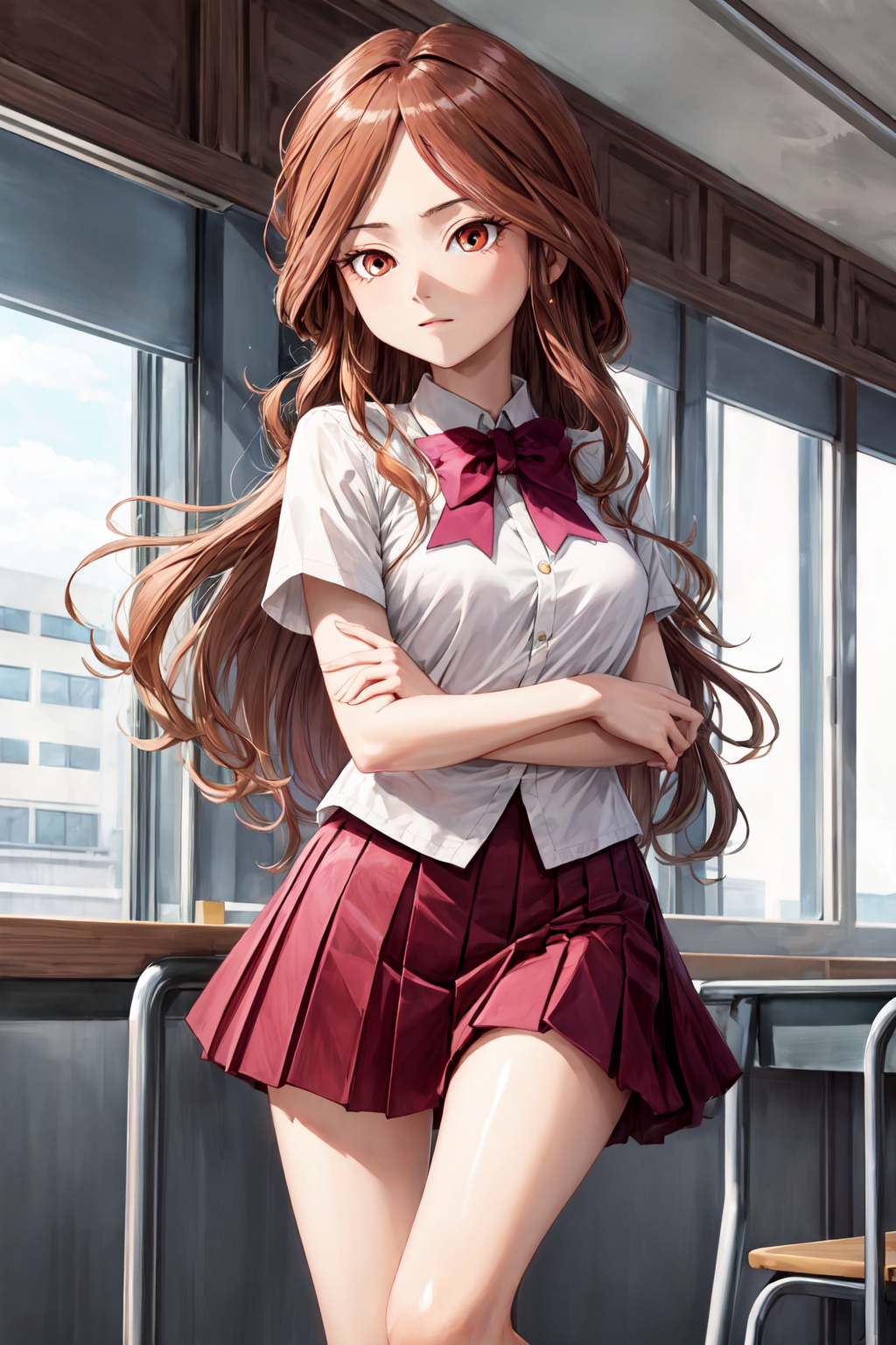 ((best quality, high quality, masterpiece, highres)), natsumi raimon, 1girl, solo, school uniform, bowtie, skirt, bow, school