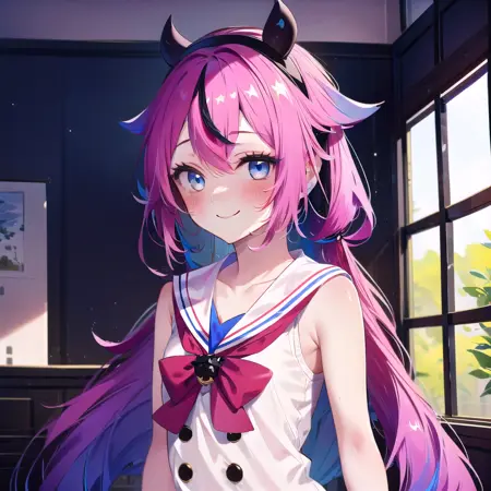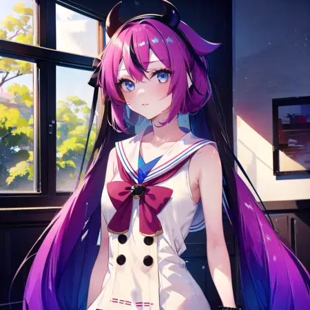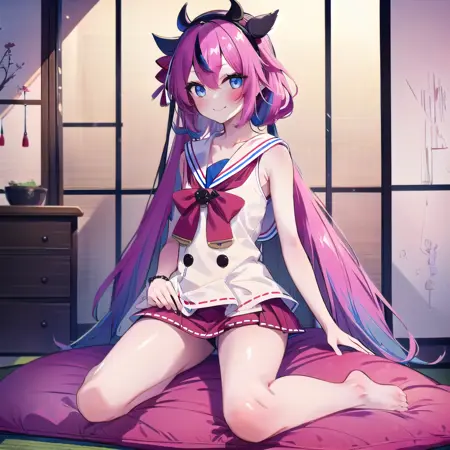 meikahime, blue eyes, twintails, pink blue multicolored very long gradient hair, hair flaps, black horn hairband, bracelet, white sailor collar, white sleeveless shirt, black buttons, red bowtie, red hakama miniskirt, bare shoulders,