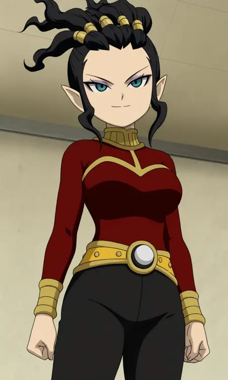 신자미(이나즈마 일레븐), 1소녀, 솔로, 검은 머리, 단발, 파란 눈, 네 개의 꼬리, 보라색 아이섀도우, 뾰족한 귀, 자나르크 도메인 유니폼, 빨간 셔츠, 긴 소매, 벨트, 노란 벨트, 검은 바지