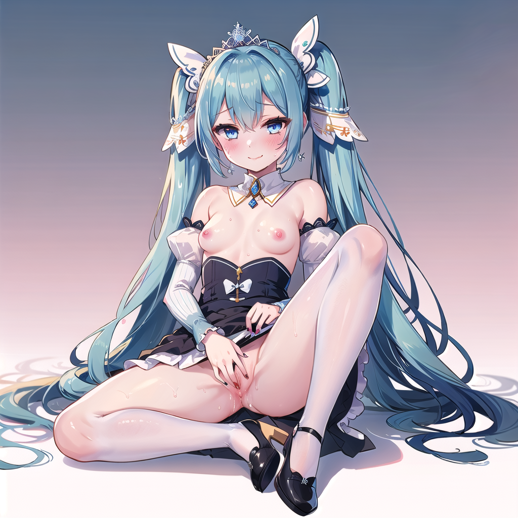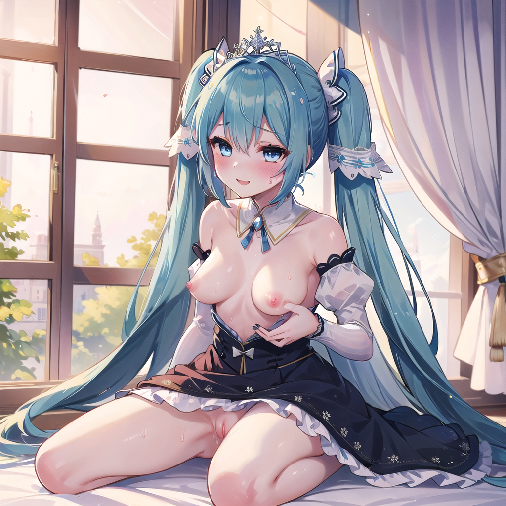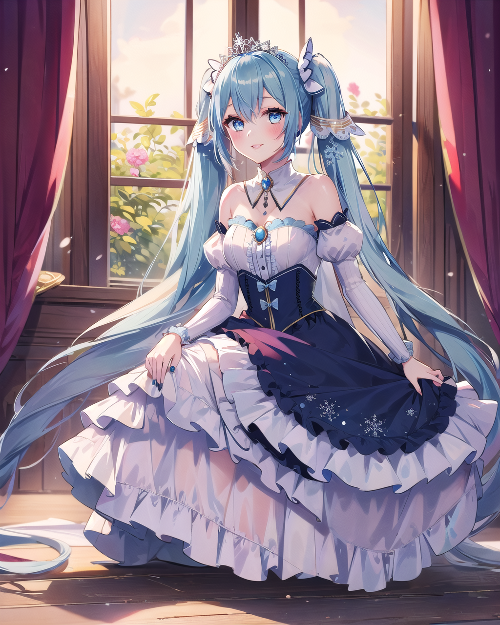 yukimiku2019, yuki miku, very long blue hair, twintails, hair ornament, blue eyes, silver tiara, detached white sleeves, juliet puffy sleeves, strapless, bare shoulders, long sleeves, blue skirt, frilled dress, bangs, frills, hair between eyes, bow, strapless dress, detached collar, blue nails, nail polish,