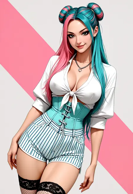 person, asian, striped hair, aqua hair, pink hair, double buns, black eyes, yellow pupils
