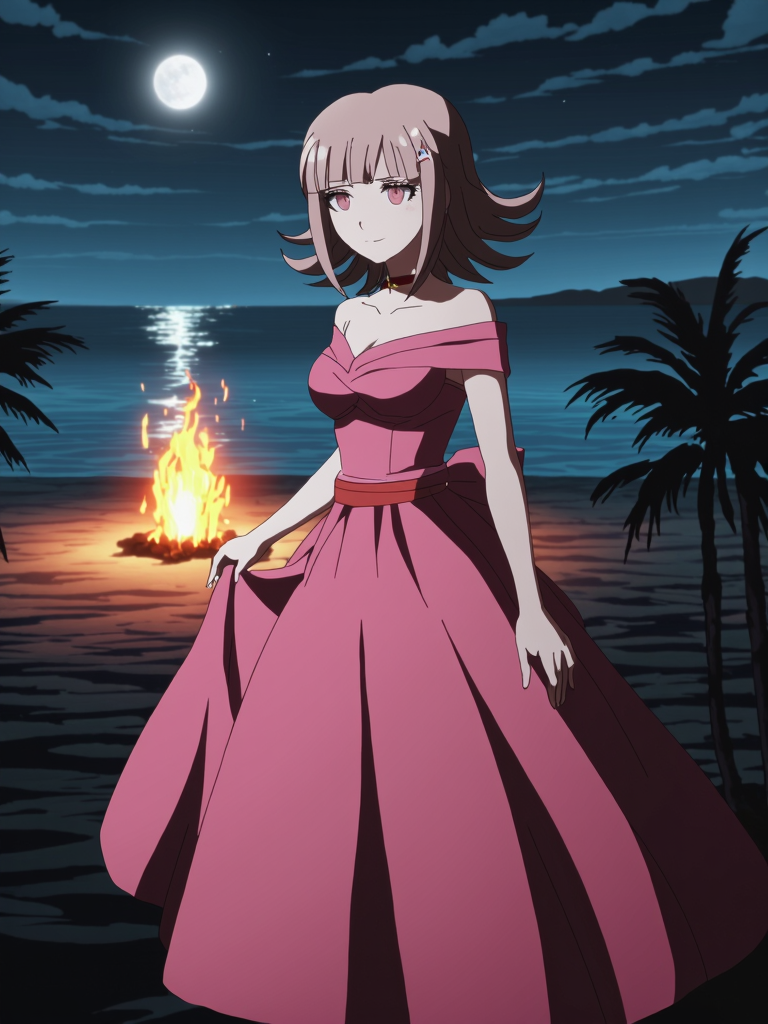 Danganronpa 10周年記念衣装: nanami_(danganronpa), Chiaki NanamiはDanganronpa 10周年記念ドレスを着ています。彼女の髪は薄いピンクがかった茶色で、短い前髪と頭の両側に小さな二つの結び目があります。目は薄いピンク色です。彼女は肩を露出させるダークピンクのドレスを着ており、胸元はハート型の重なりのあるデザインで、ウエストには濃い赤の幅広いサッシュが背中で蝶結びになっています。スカートはふんわりと広がっています。また、首にはシンプルな赤いチョーカーを着用しています。単一の小さなGalaga宇宙船をモチーフにしたヘアクリップを身に着けています。1girl,bare_shoulders,blunt_bangs,braid,breasts,choker,collarbone,danganronpa_(series),danganronpa_10th_anniversary_costume,danganronpa_2:_goodbye_despair,dress,emerjk-9,galaga,hair_ornament,medium_breasts,nanami_chiaki,off-shoulder_dress,off_shoulder,official_alternate_costume,pink_choker,pink_dress,pink_eyes,pink_hair,short_hair,short_sleeves,spaceship_hair_ornament
