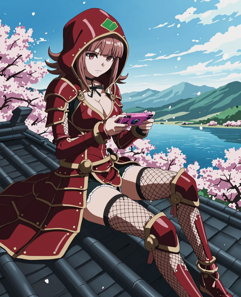 Asuka Zero衣装(忍者風の衣装): nanami_(danganronpa),nanami_chiaki, asuka_zero, Chiaki NanamiはAsuka Zeroの衣装を着ています。彼女は木製の床に正座し、体幹は前を向いており、頭は少し前傾しています。右腕は肘を曲げて前方に伸ばし、右手で床に斜めに置かれた katana の柄を握っています。左腕は自然に体の横に垂らされています。彼女は葉の模様が施された鮮やかな赤いフード付きのマントを着ており、フードには猫の耳があり、胸元に赤いリボンが垂れ下がっています。マントの下には濃い赤のブラトップとマッチングする濃い赤のショートパンツを着用しています。トップは胸元を露出させ、肩と上腕の肌も露出しています。腹部と腕は薄いフィッシュネット素材で覆われています。膝上までの黒いブーツを履いており、ゴールドの縁取りが施されています。表情は穏やかで、目は大きく、ピンク色で、まっすぐ前方を見つめています。シーンは2つのランタンの柔らかな黄色い光で照らされており、強いハイライトと深い影が夜の設定を示しています。背景の右上には満月が明るく輝いています。アートスタイルはアニメで、詳細なシャドウと柔らかい色調が特徴で、ピンクの桜の花びらや、遠くの伝統的な日本の建物や山の濃い青色が強調されています。, detailed_background, danganronpa_(series), alternate_costume, 1girl, solo, medium_hair, brown_hair, pink_eyes, japanese_armor, red_armor, lamellar_armor, shoulder_armor, arm_guards, leg_armor, fishnet_stockings, fishnet_clothing, thigh_highs, exposed_shoulders, midriff, navel, tassets, ninja, armor_skirt, segmented_skirt, mon_(crest), clan_symbol, breasts, medium_breasts, cleavage, bikini_armor, mole_on_breast, hood_up, hair_ornament, hairclip, galaga, green_crest, green_mon, ancient_japanese_castle, cherry_blossoms, falling_petals, stone_lanterns, holding_katana, moonlight, mist, traditional_architecture, kneeling