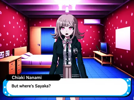 Danganronpa SゲームのUI(実際のDanganronpa SのGUIレイアウトへの準拠はやや不安定): nanami_(danganronpa), Chiaki Nanami, nanami_chiaki,, aesthetic 11, komatsuzaki_rui_(style), Chiaki NanamiはDanganronpa 2の制服を着ています。画像はDanganronpaのスプライトスタイルとDanganronpa SのGUIスタイルです。Chiakiは短く、ほんのりピンクがかった茶色の髪を持ち、やや外側にカールしていますが、顔の両側の髪の束は内側にカールしています。右に分け目のある短いストレートの前髪で、髪の束に白いGalagaヘアクリップが差されています。目は桜ピンク色です。Chiaki Nanamiは、濃いターコイズグレーの前ボタン部分を持つ白いボタンアップシャツと、首に薄いピンクのリボンを蝶結びで巻いています。また、濃いターコイズグレーのフード付きカーディガンを着ており、裾と袖口には灰色の横縞が入っています。画像の背景とその他の要素をここに挿入してください。 画像の下部には標準的なDanganronpa SのGUIスタイルの会話ボックスがあります。「Chiaki Nanami」は会話ボックスの上部に青い背景と白い星と共に表示されています。会話ボックス内のテキストは「INSERT YOUR TEXT HERE」です。会話バルーンの上部には黒いバルーンがあり、白い文字で「Chiaki Nanami」と表示され、バルーンの周囲には青と白の星が配置されています。この画像はゲームDanganronpa Sからのものです。