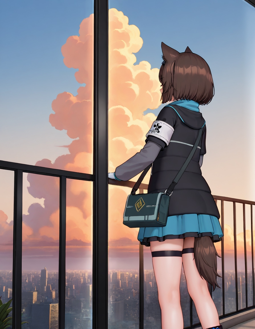 1girl, medicark, short hair, brown hair, brown eyes, cat ears, hairband, blue scarf, black short sleeved jacket, armbanda, long sleeves shirt, layered sleeves, layered skirt, white gloves, thigh strap, shoulder bag, tail, id card, armbanda, black sneakers, anklet, socks