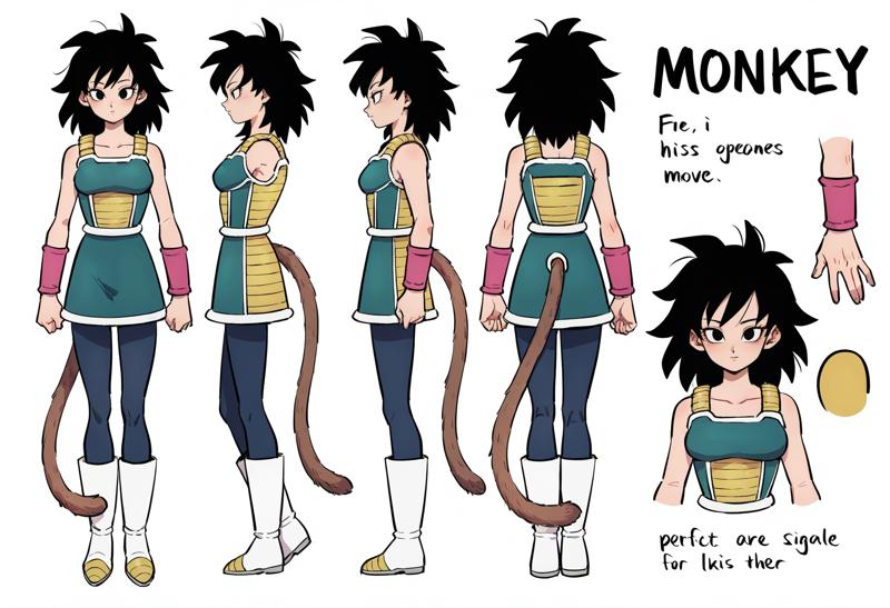 ブーツ、尾、猿の尾、白い靴下、サイヤ人アーマー、アーマー、タイツ、リストバンド、胸、腕を露出、青いタイツ、スカート、肩を露出、中程度の胸、ドレス、小さな胸、ノースリーブ、黒いタイツ、公式スタイル、髪の毛の一本、膝上ブーツ、緑のスカート