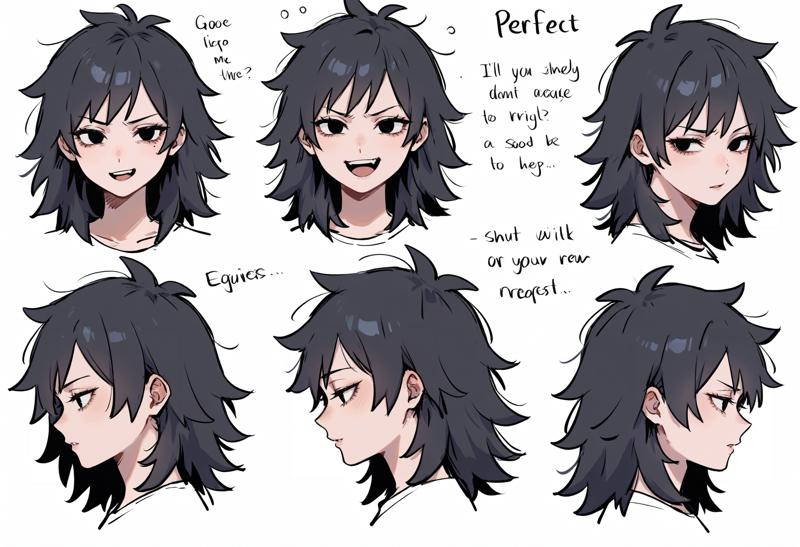 1人の女の子、黒い目、まつげ、黒髪、乱れた髪、短髪、中程度の髪、前髪、とがった髪