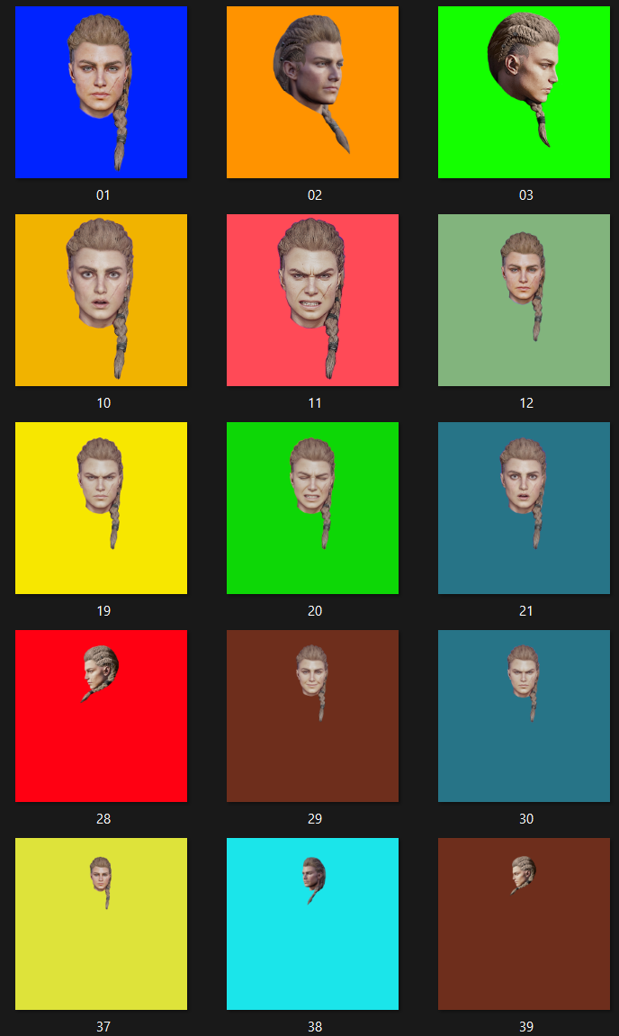 非常に大変でした。すべての可能な視点から4Kでエイヴォールの顔を収集し、標準的な構図(クローズアップ、上半身、全身)にリサイズしました。さらに、笑顔、怒り(口を閉じた)、激怒(歯を食いしばった)、痛み(目を閉じた)、驚き(目を見開いた)の5種類の表情を追加しました。これにより、SFWでもNSFWでも使える、詳細でリアルな表情セットが完成しました。たとえば、目を閉じた、口を開けた、歯を食いしばった、目を見開いた、笑った目、目を見開いたなど、それぞれの表情はSFWとNSFWの両方で異なるシーンに応じて活用できます。