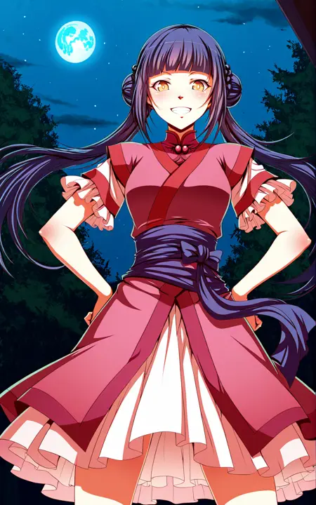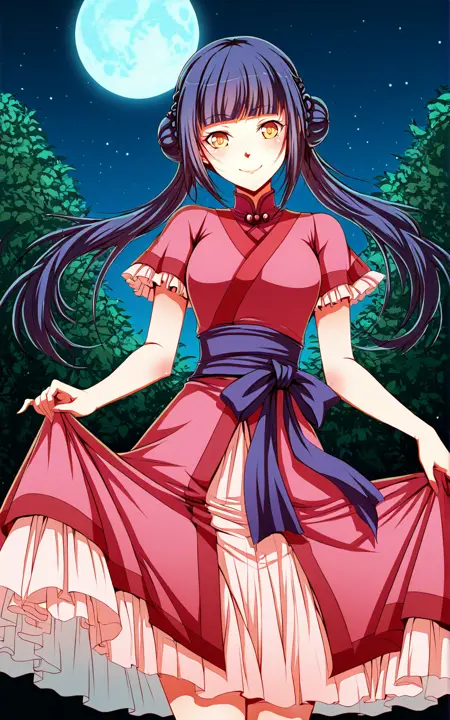 Luoyanv1_衣装、ピンクのドレス、赤いトリムのドレス、短い袖、フリル付き袖、ピンクのインナートップ、紫のウエストサッシュ、ピンクのオーバースカート、白いアンダースカート、透けたアンダースカート、フリル付き裾、赤い靴