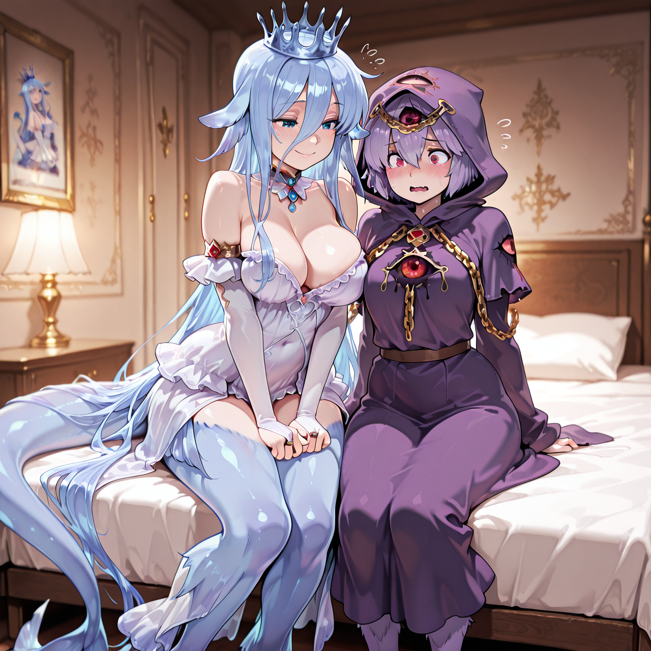 ケルピー:kelpie_(monster_girl_encyclopedia), bridal_gauntlets, crown, hair_over_breasts, white_dress, topless fish_tail