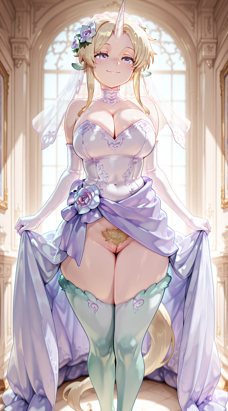 ユニコーン:unicorn_(monster_girl_encyclopedia), single_horn, wedding_dress, bridal_veil, elbow_gloves, hair_flower, sash, horse_tail, navel