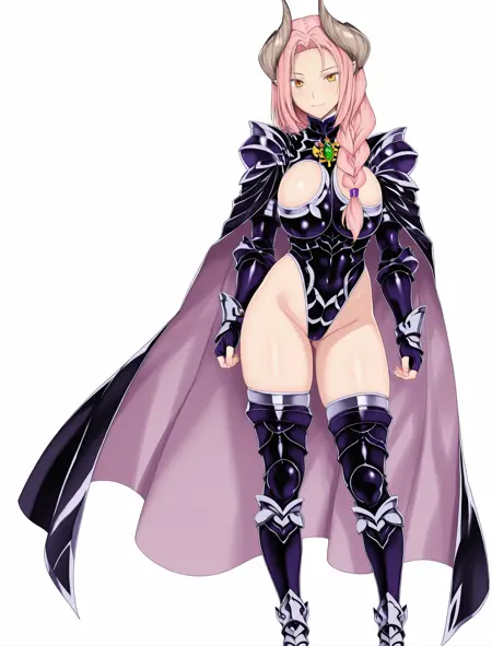 | 训练词汇 | RoygunBelphegorDxD,1girl,breasts,solo,pink hair,pointy ears,parted bangs,long hair,horns,single braid,yellow eyes,braid,large breasts,light brown horns,已复制! purple armor,cape,thighhighs,fingerless_gloves,pauldrons,gauntlets,shoulder armor,clothing cutout,highleg leotard,cleavage cutout,high heels,已复制! |