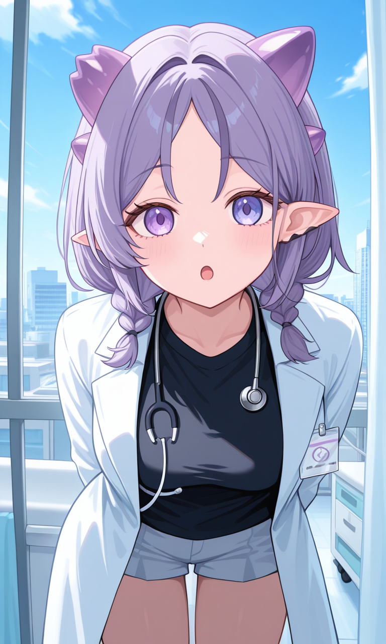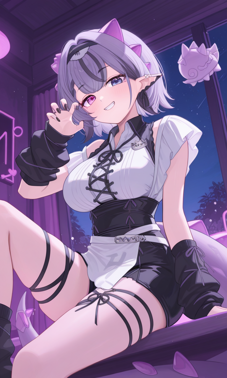 compsaurus, short hair, hairband, horns, white shirt, sleeveless, arm warmers, underbust, high-waist shorts, waist apron, thigh strap, tail