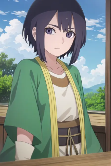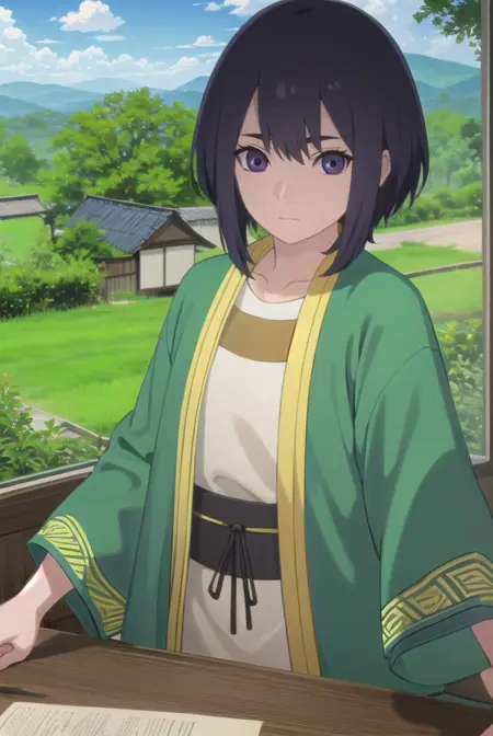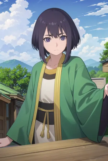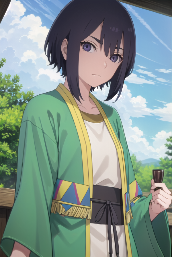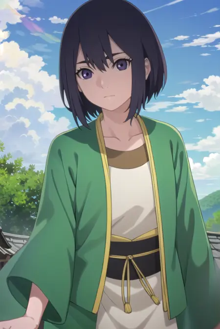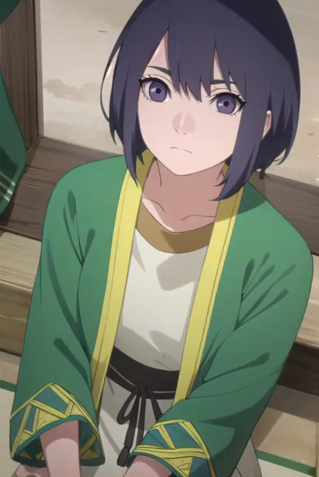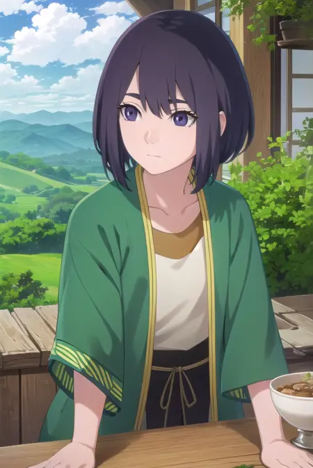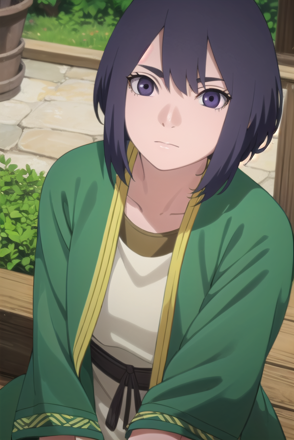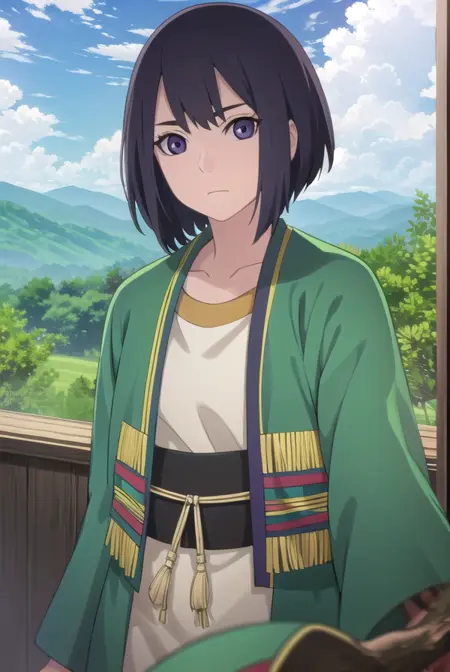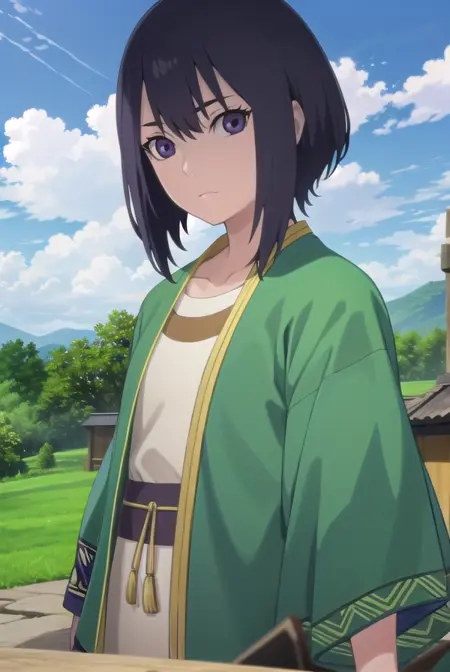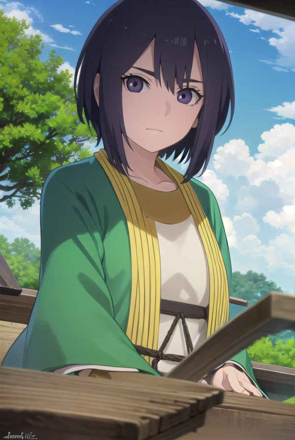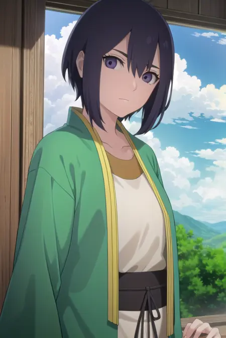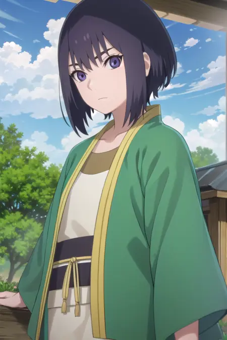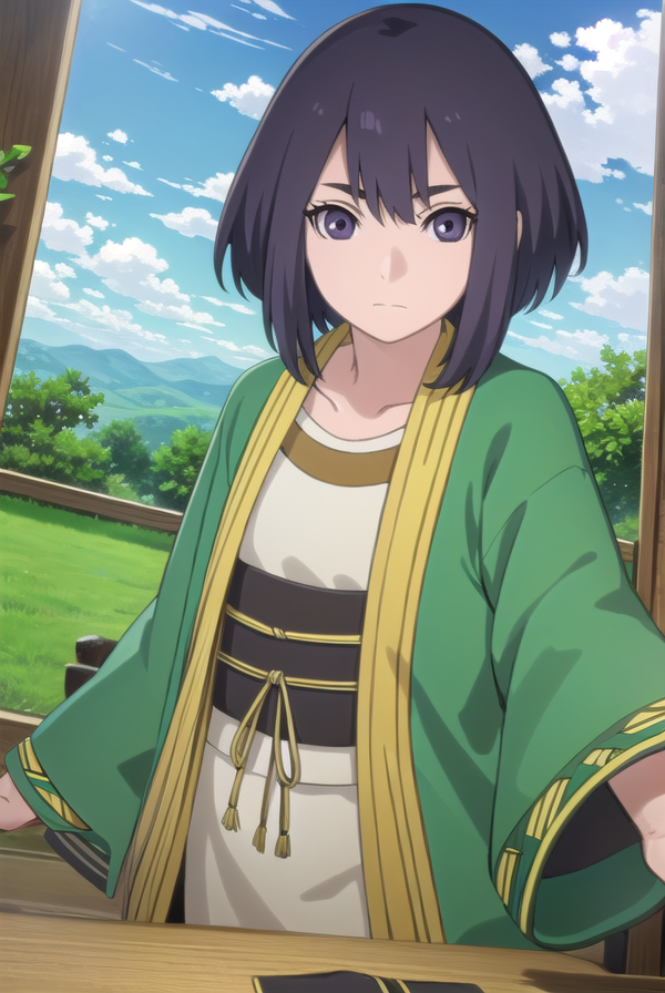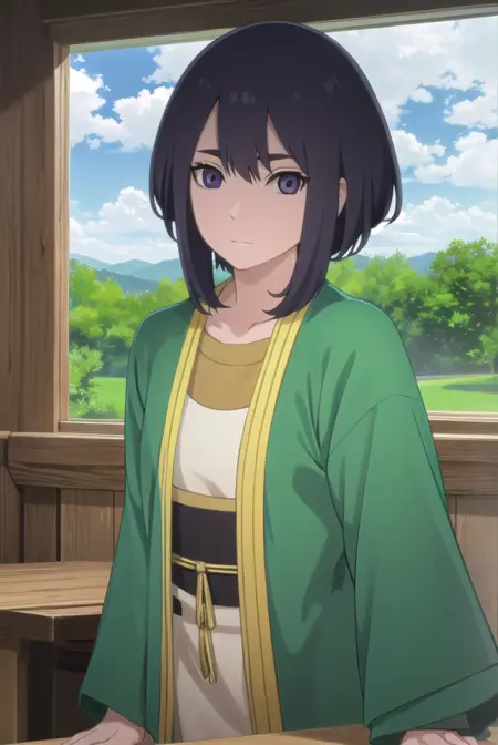 lady kiri、黒髪、短髪、目の中の髪、(紫の目:1.1)