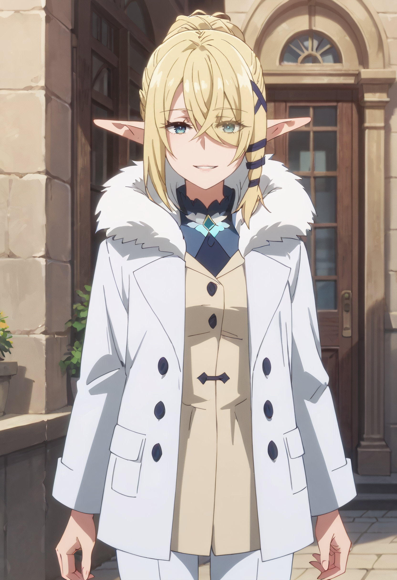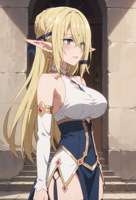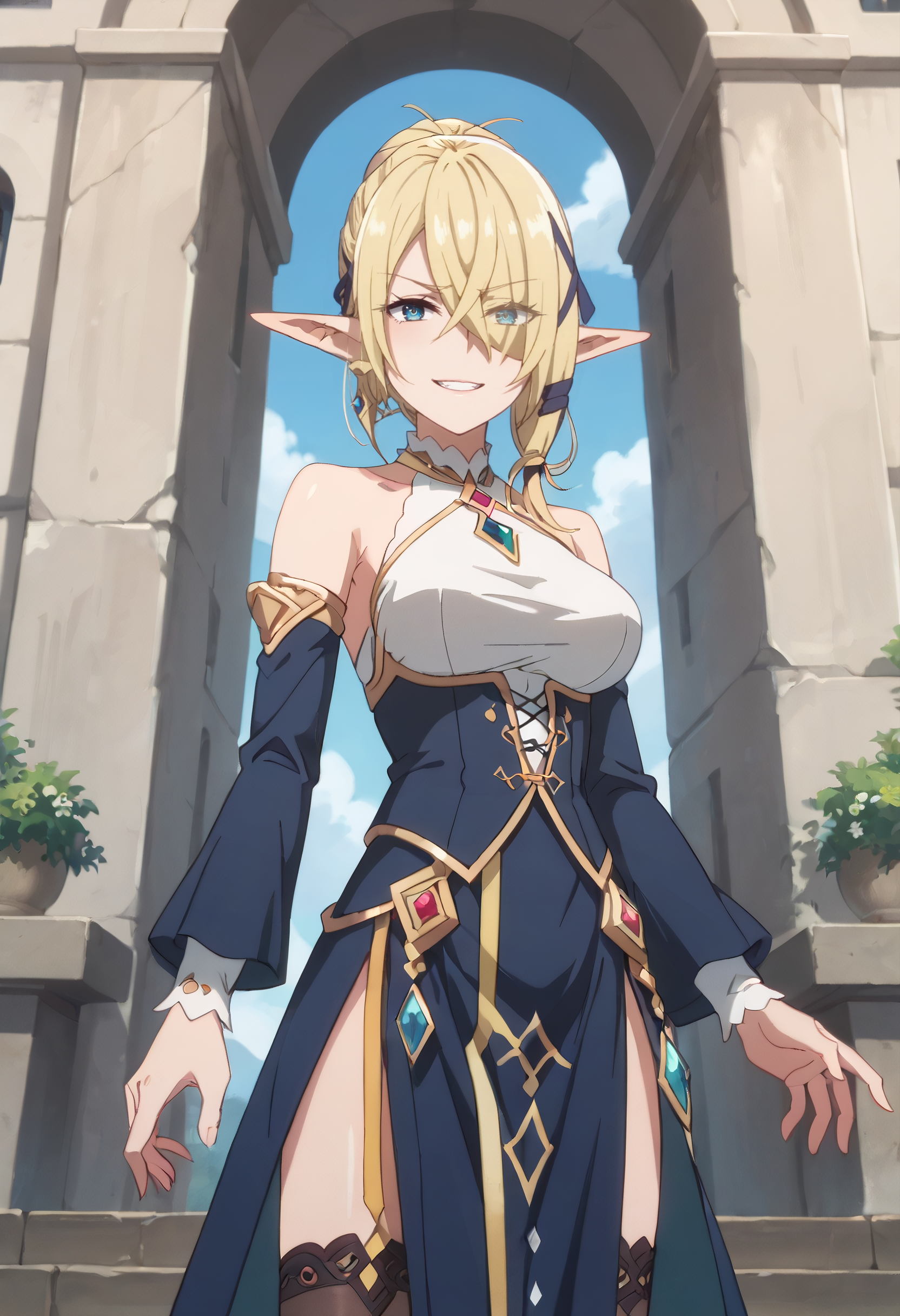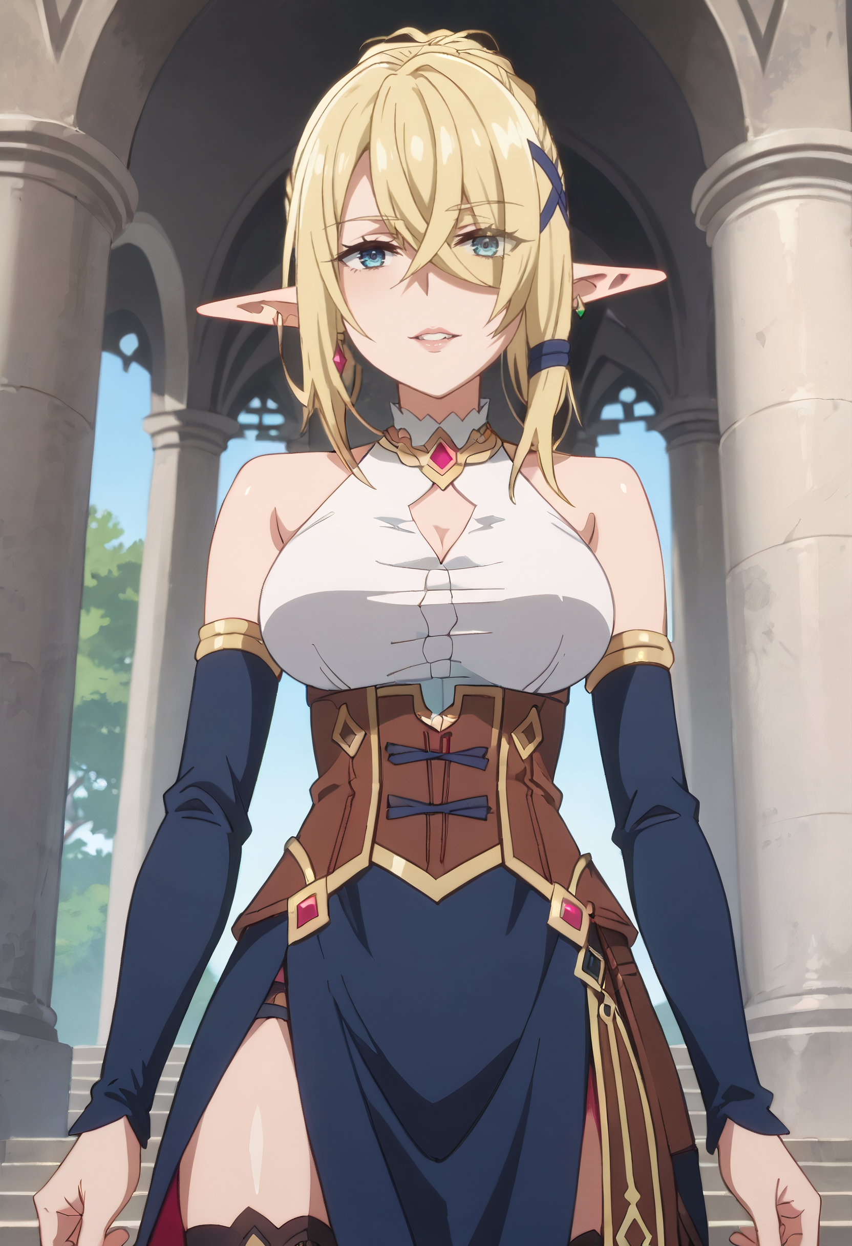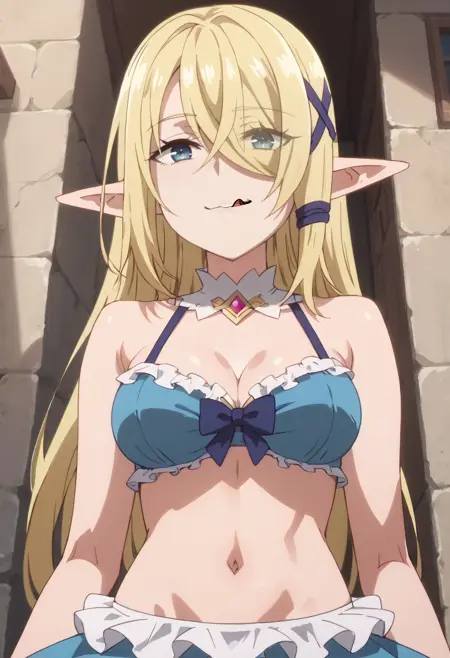 BLeona,精灵,尖耳朵,头发遮住眼睛,金发,蓝眼睛,长发,刘海,头发下可见眉毛,长尖耳,鬓发,头发遮住一只眼睛,