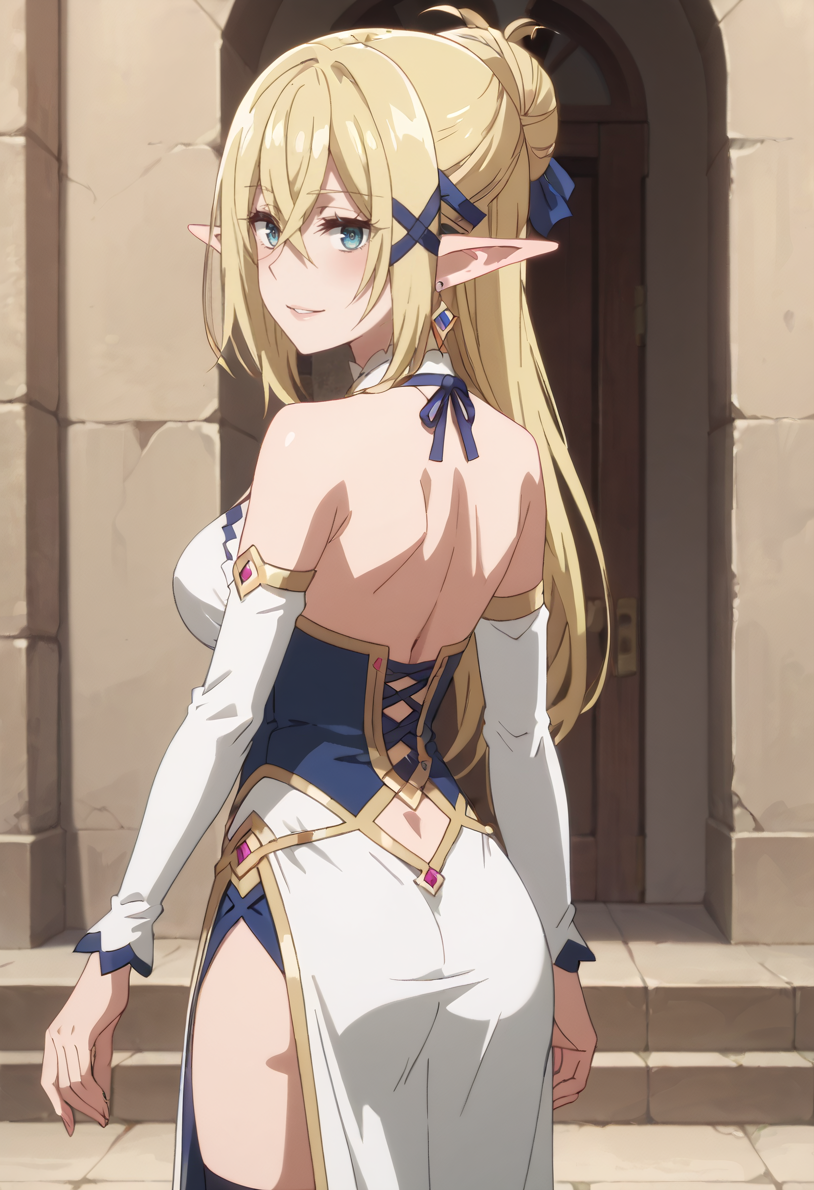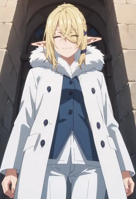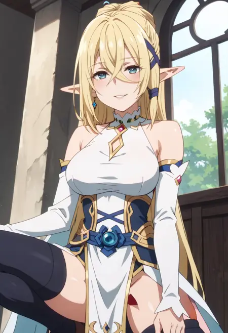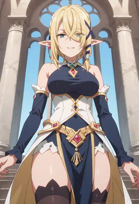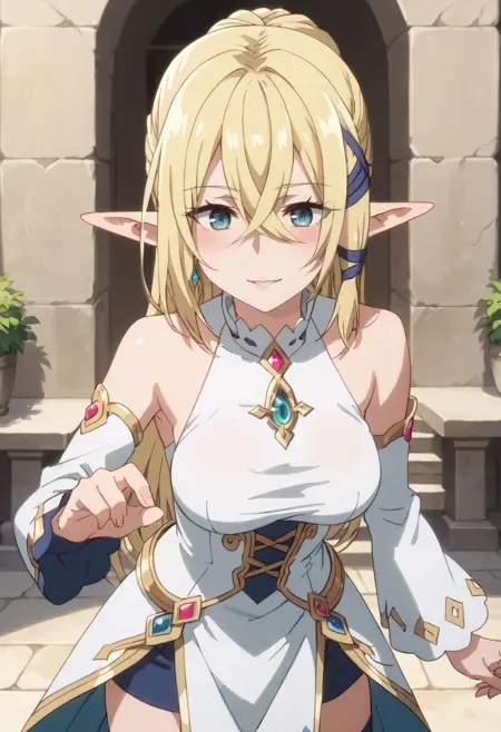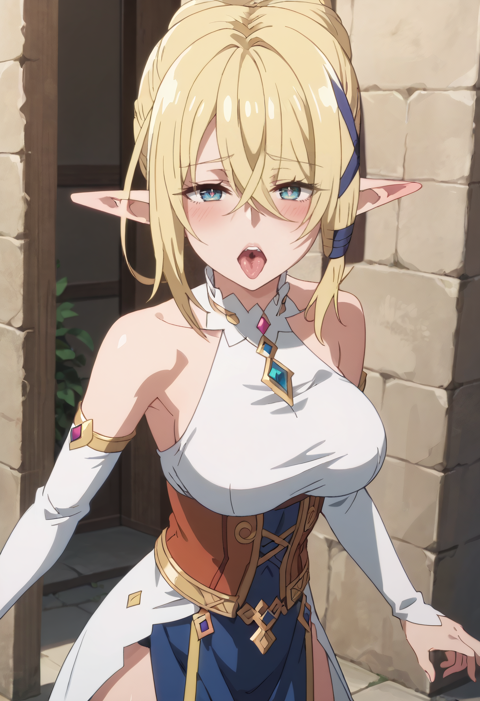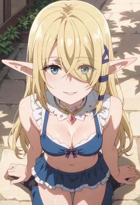 BLeona,精灵,尖耳朵,头发遮住眼睛,金发,蓝眼睛,长发,刘海,头发下可见眉毛,长尖耳,鬓发,头发遮住一只眼睛,