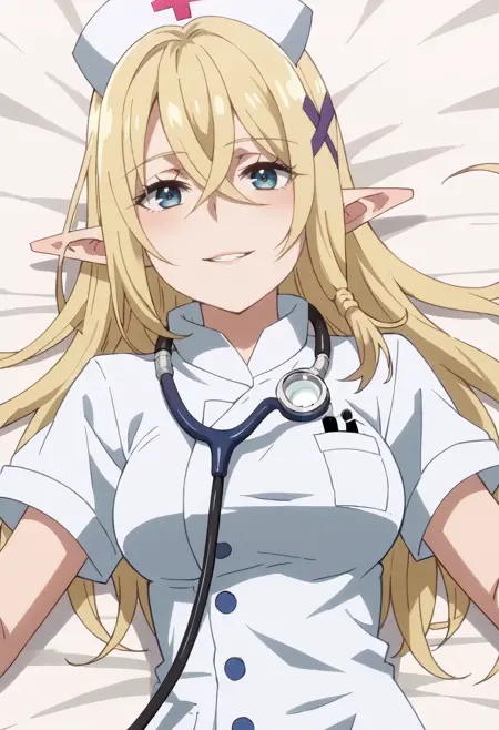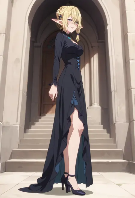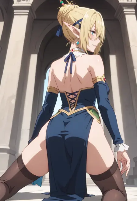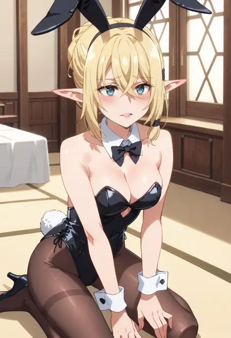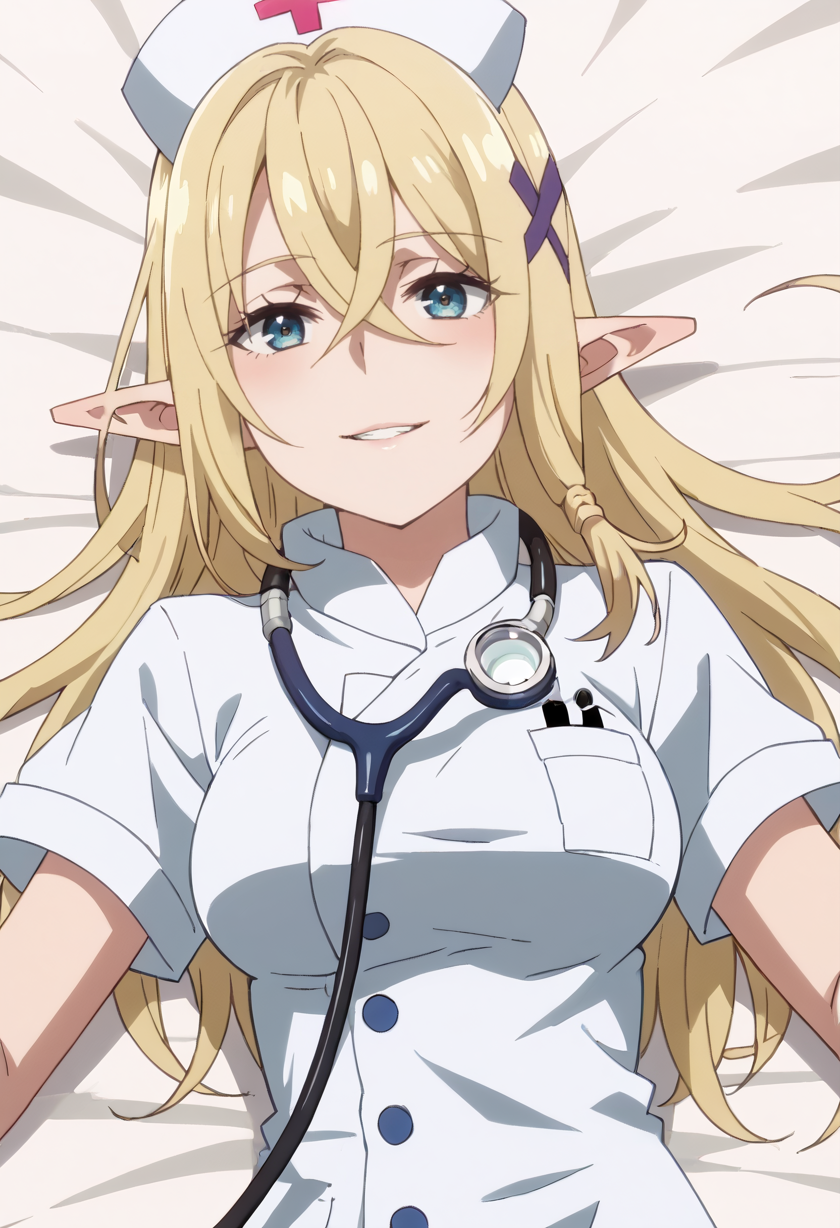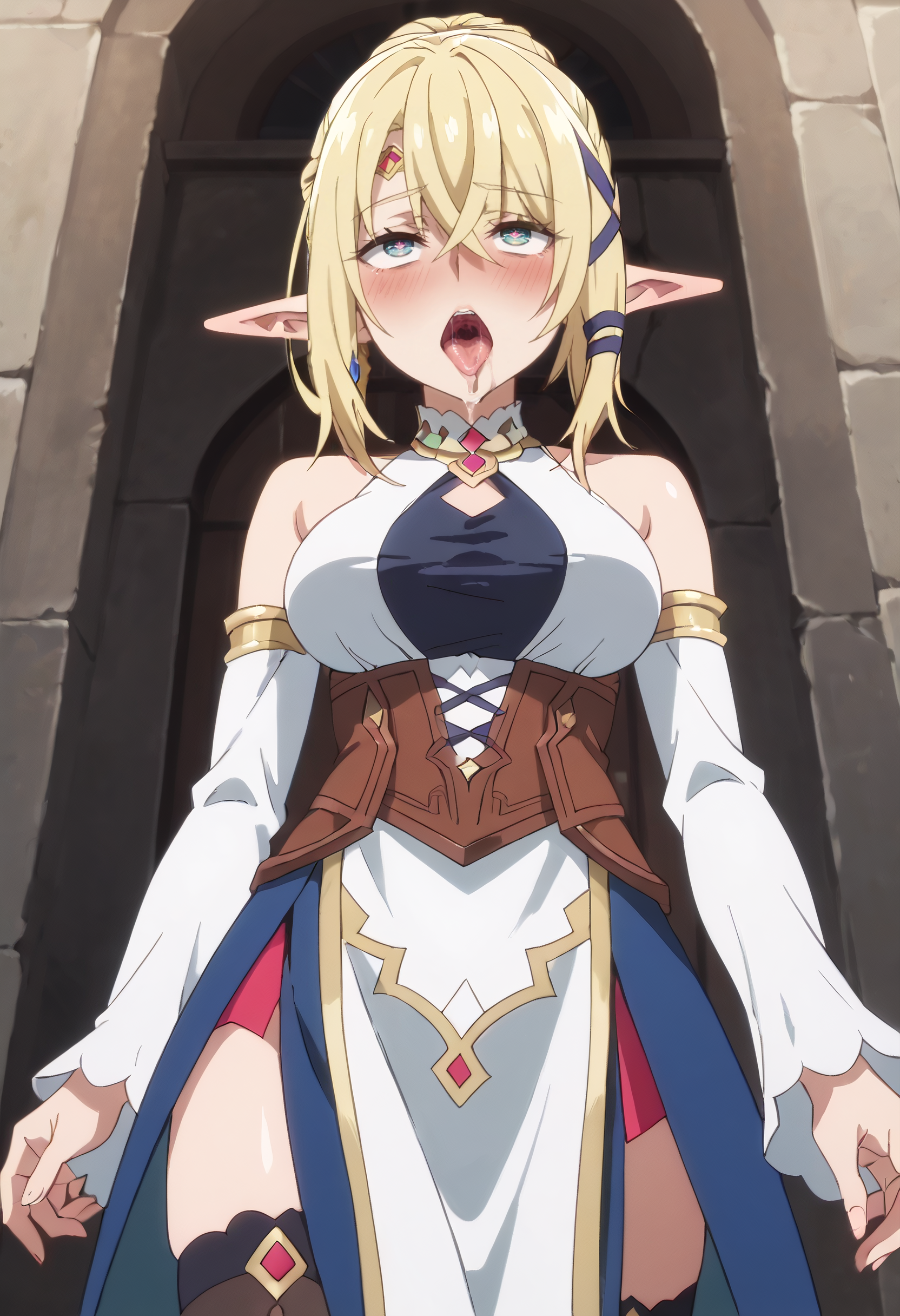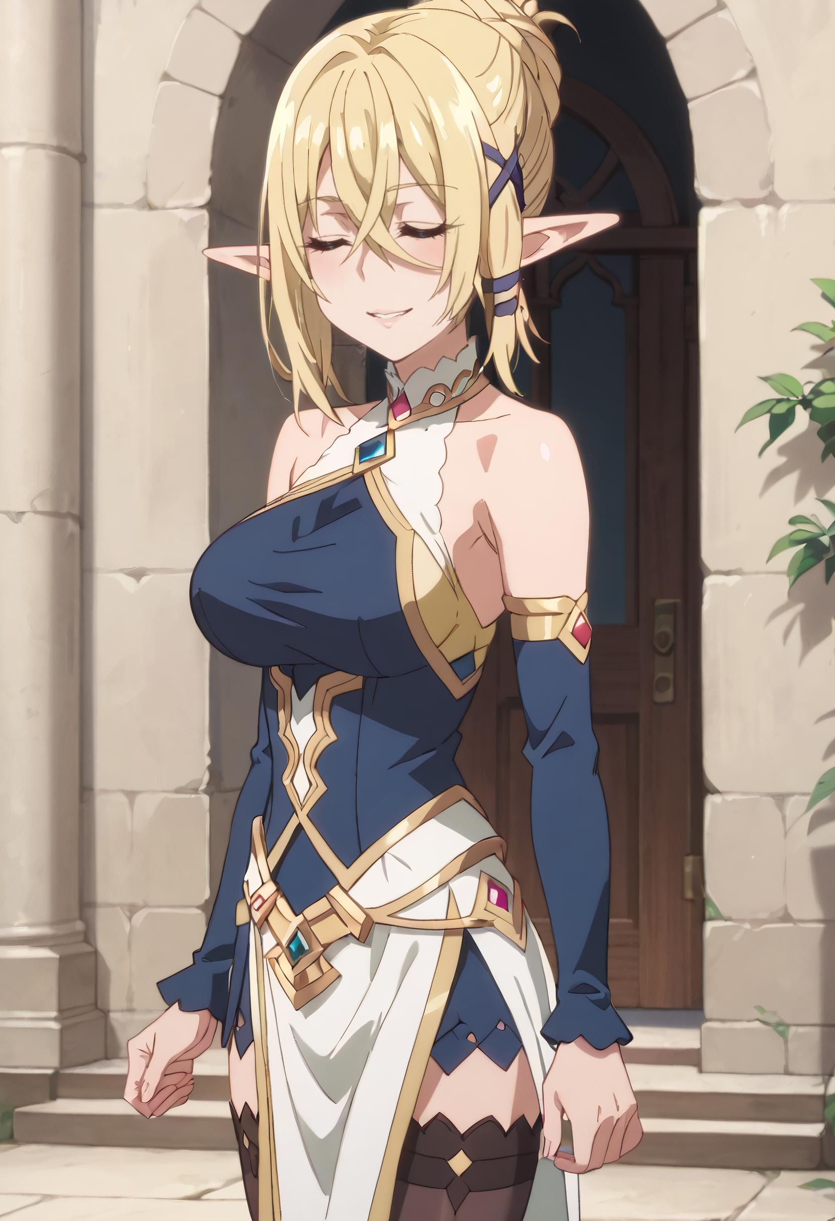 BLeona,精灵,尖耳朵,头发遮住眼睛,金发,蓝眼睛,长发,刘海,头发下可见眉毛,长尖耳,鬓发,头发遮住一只眼睛,