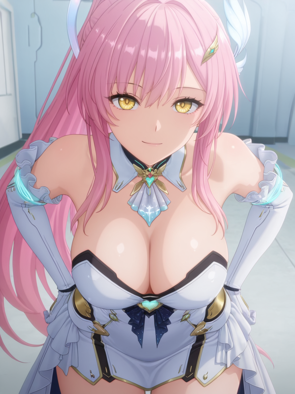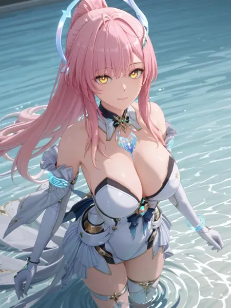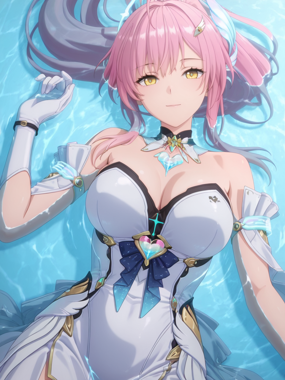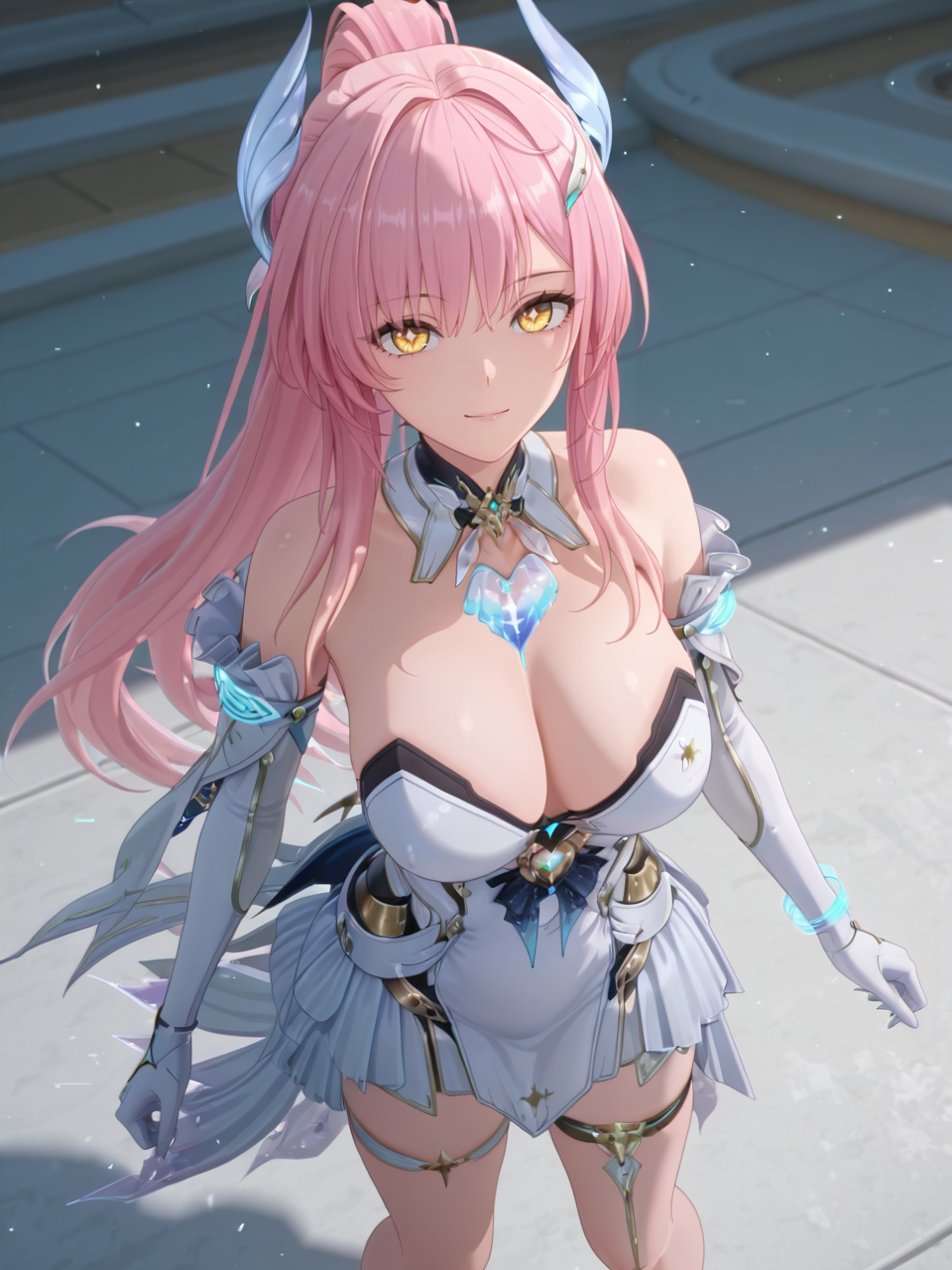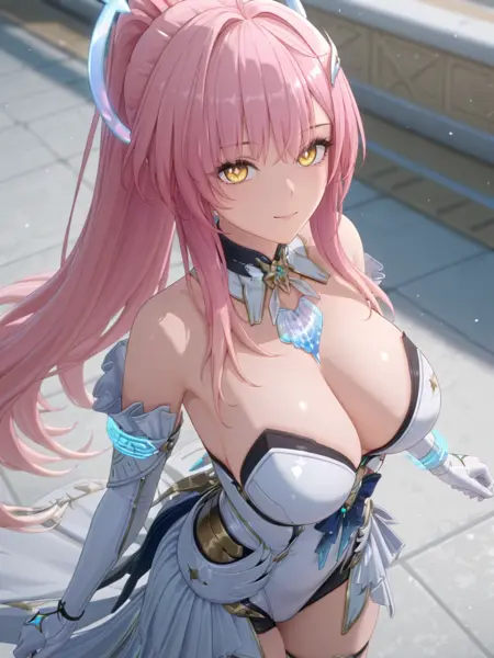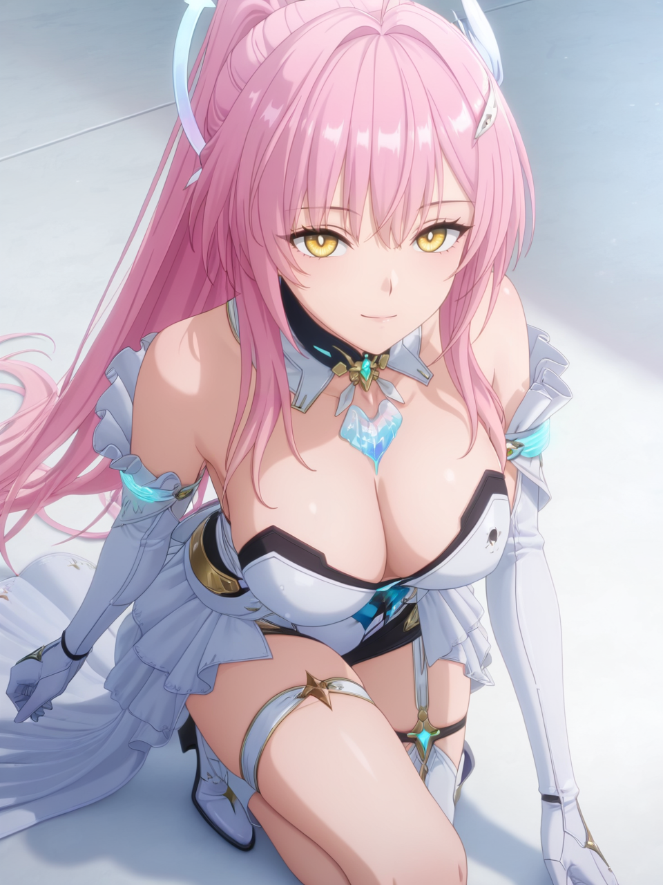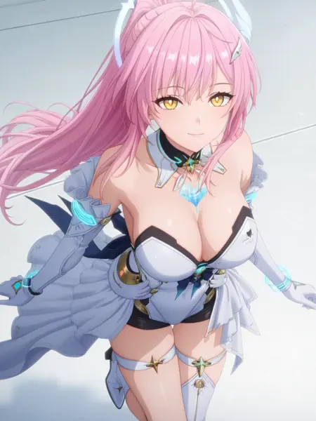 plww, 1girl, solo, long hair, pink hair, ponytail, hair ornament, white dress, yellow eyes, bare shoulders, white gloves, detached collar, large breasts, high heel boots, asymmetrical legwear