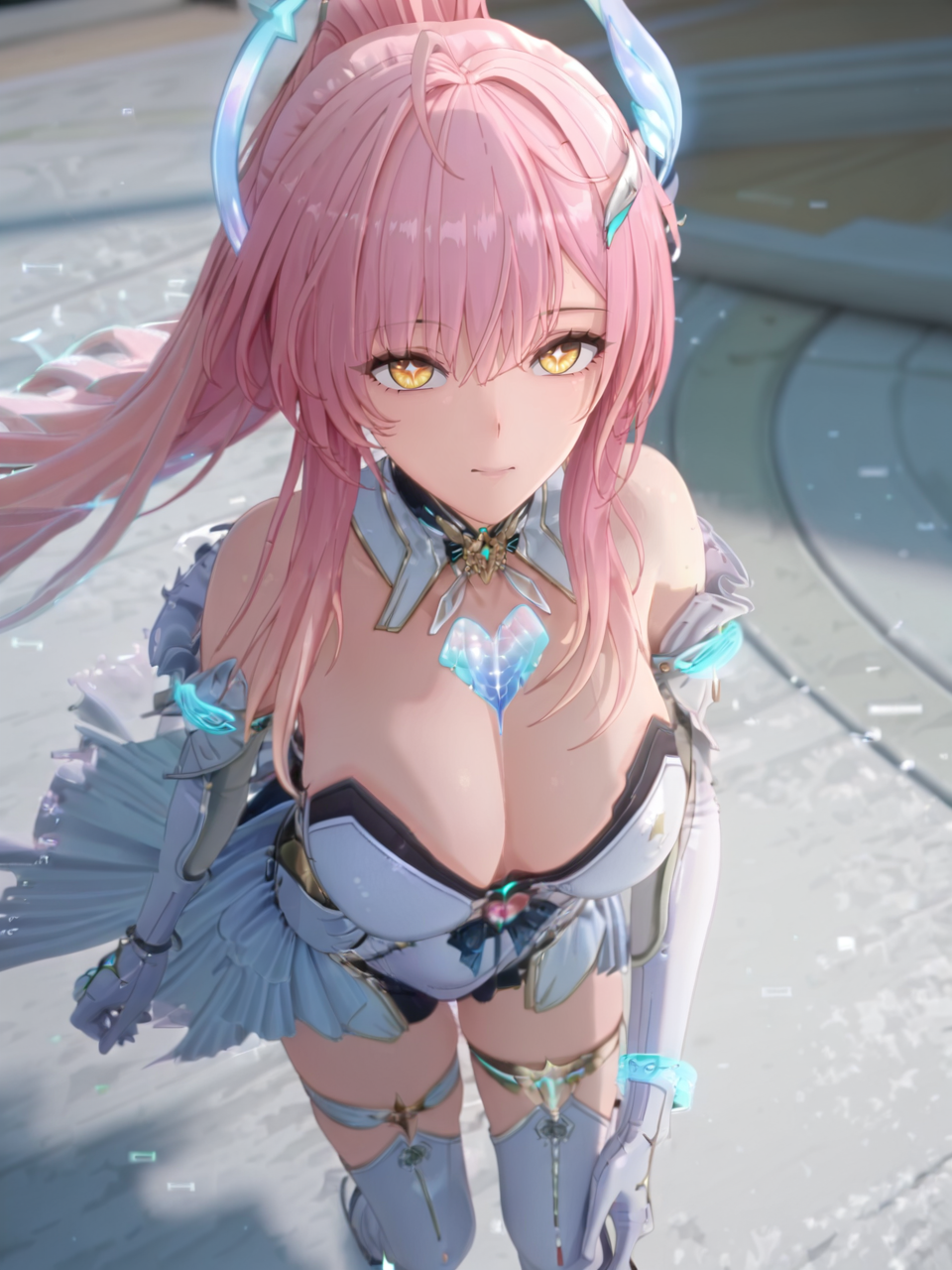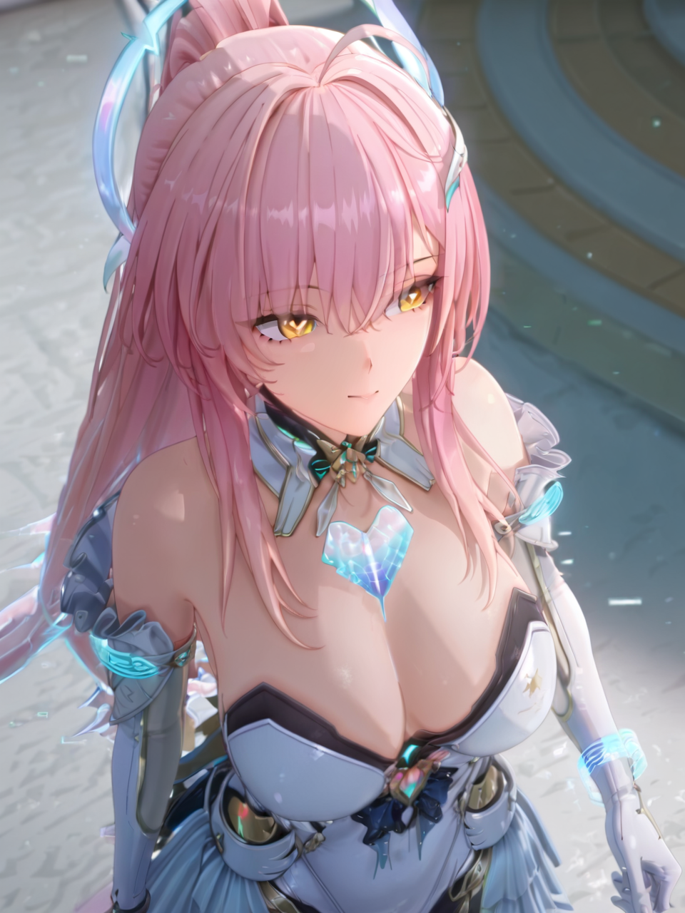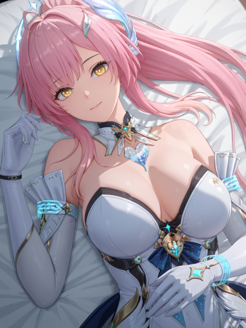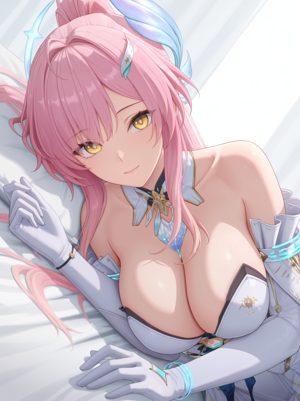plww, 1girl, solo, long hair, pink hair, ponytail, hair ornament, white dress, yellow eyes, bare shoulders, white gloves, detached collar, large breasts, high heel boots, asymmetrical legwear