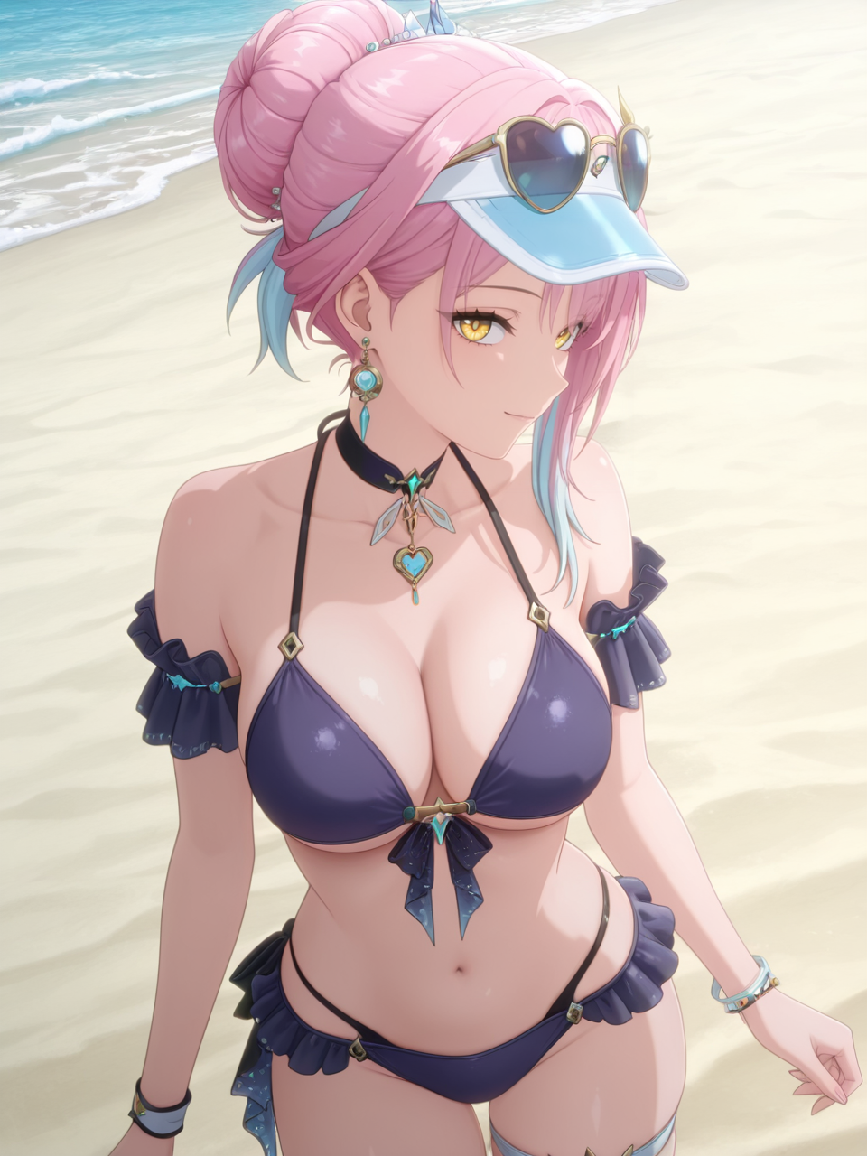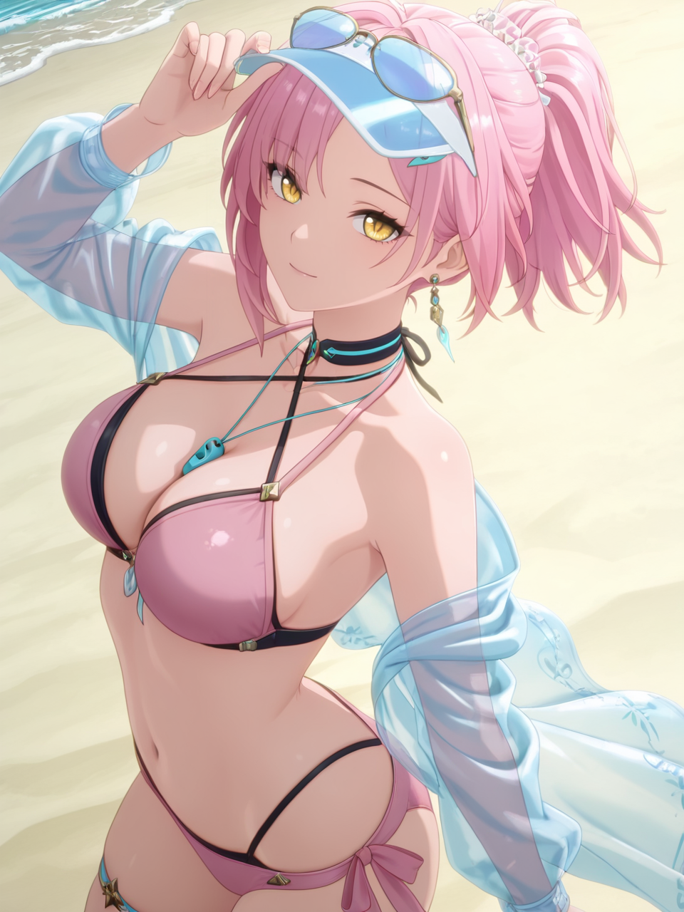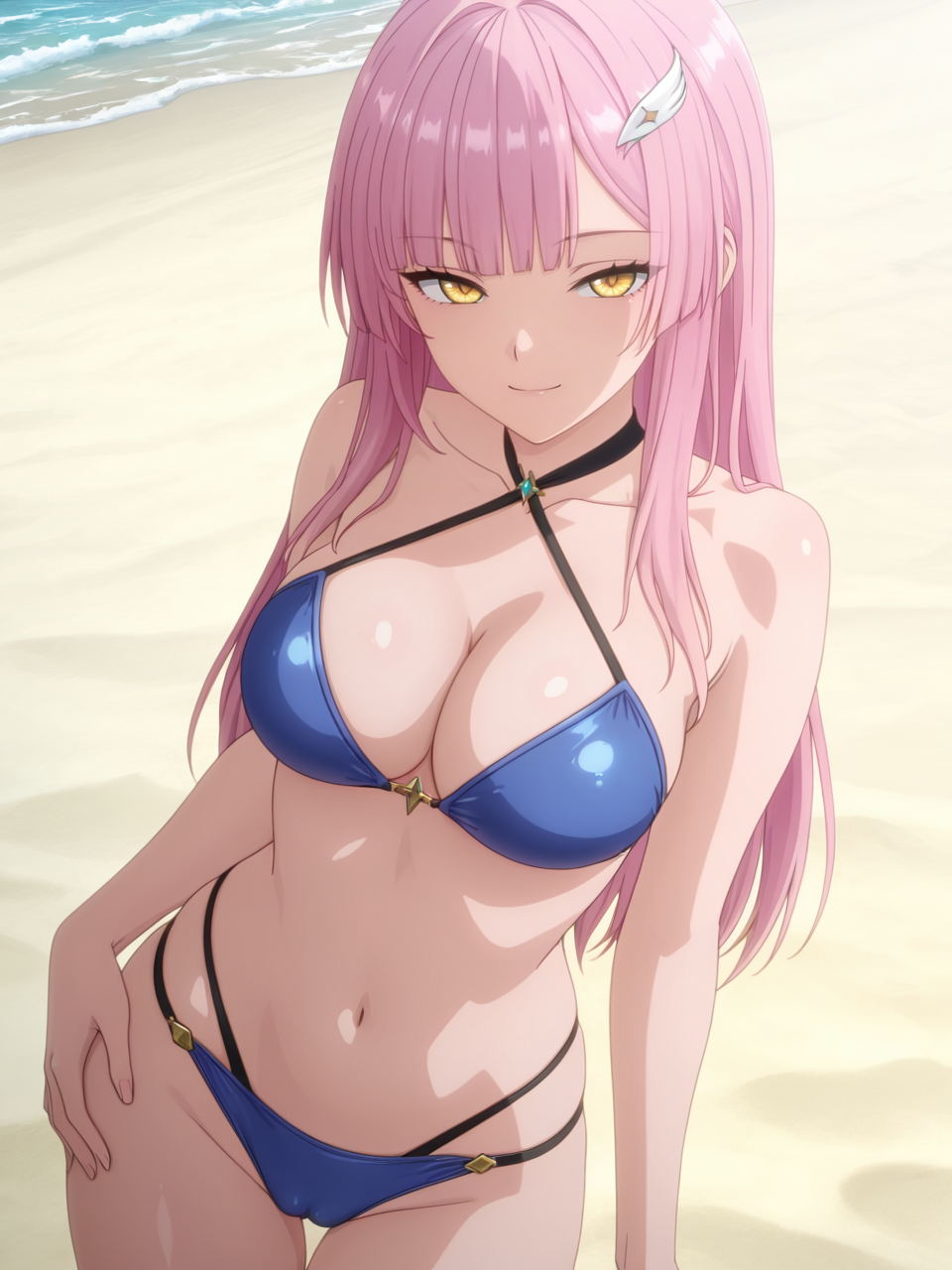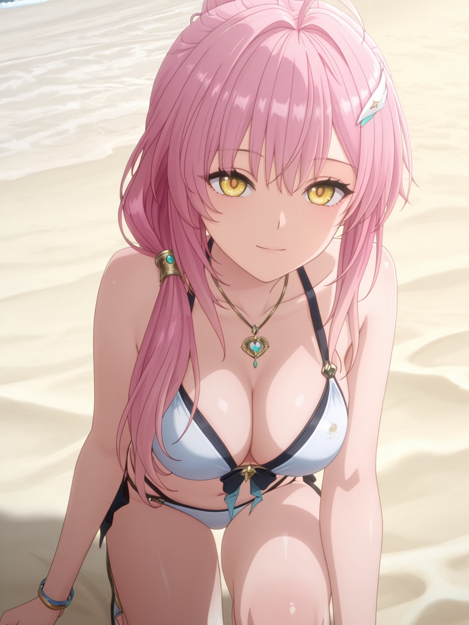 plww, 1girl, solo, long hair, pink hair, ponytail, hair ornament, white dress, yellow eyes, bare shoulders, white gloves, detached collar, large breasts, high heel boots, asymmetrical legwear