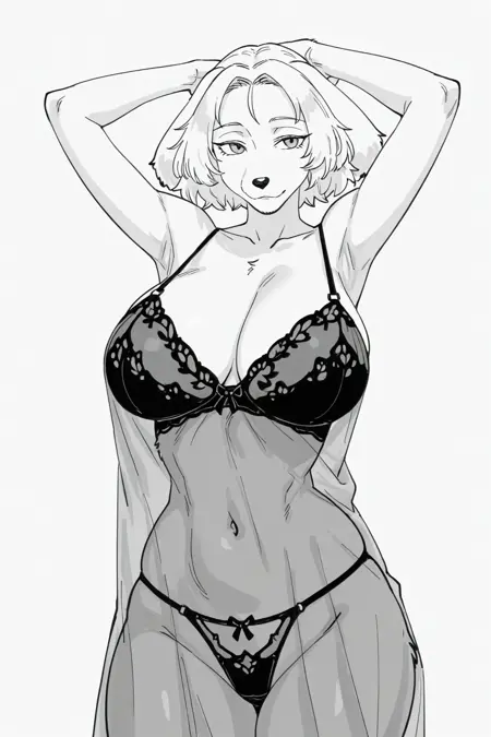 태그: dm_k, 앤트로, 페어리 여성, 개녀, 개 꼬리, 개 귀, 흰 머리, 단발, 갈색 코, 갈색 눈,
