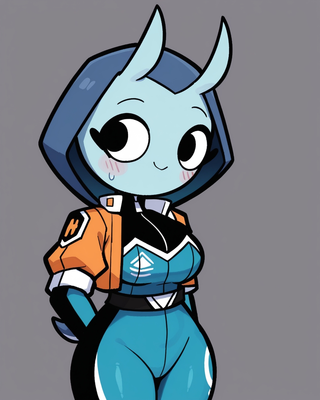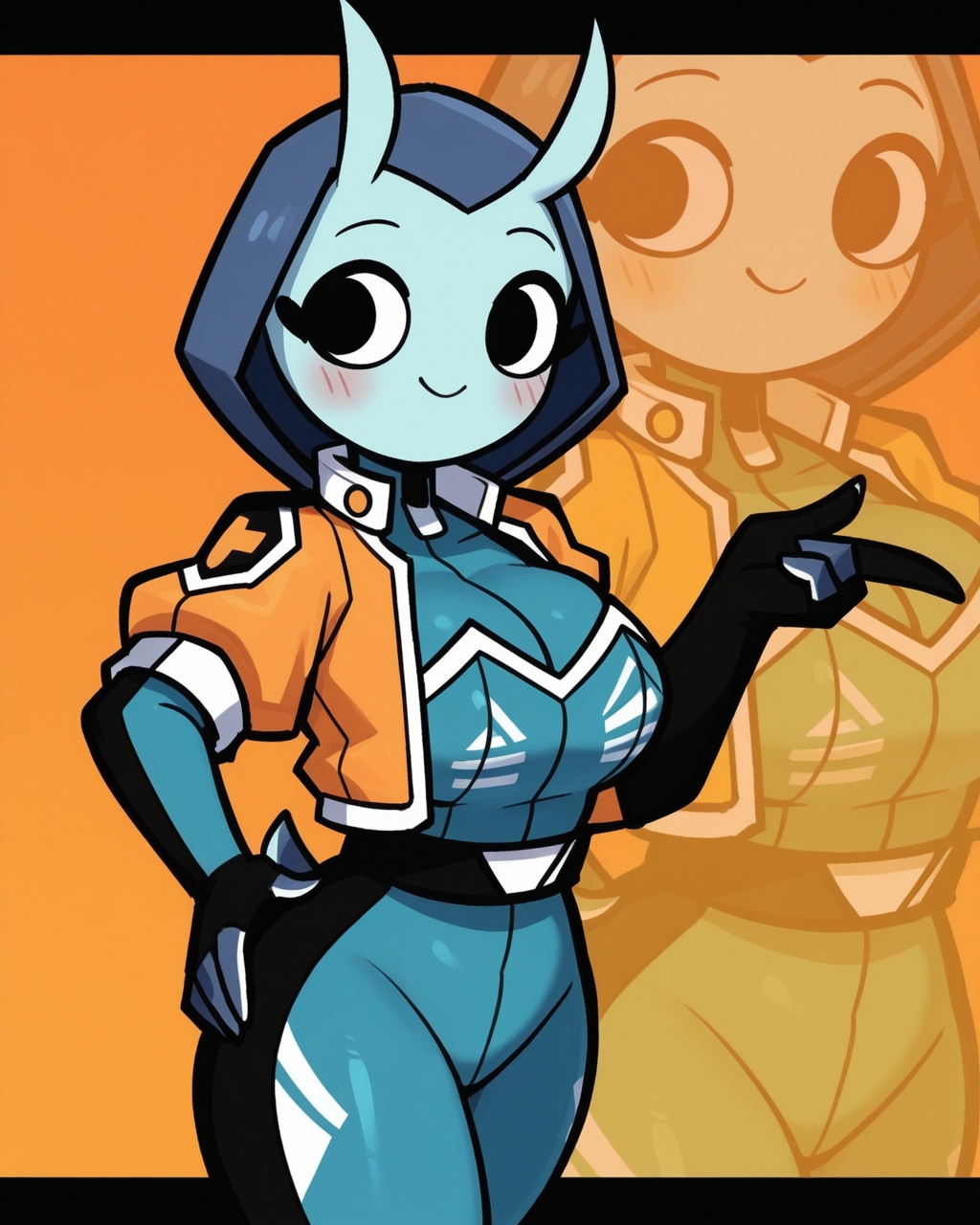 标签:myria,1girl,单独,胸部,有色皮肤,大乳房,脸红,黑眼睛,蓝皮肤,夹克,简单背景,角,蓝发,微笑,短款夹克,外星人,站立,兜帽,锯齿状线条,紧身衣,橙色背景,牛仔镜头,短袖,敞开的衣物