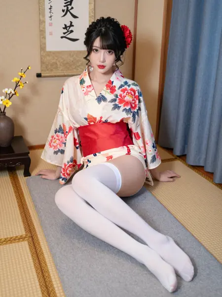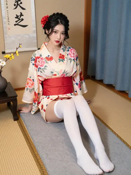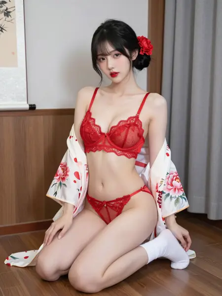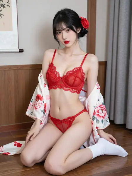 NSFW Z-IMAGE Japanese Lingerie Fusion Style – Crimson Lace Bra Set Paired With Floral Kimono Outerwear & White Ankle Socks
