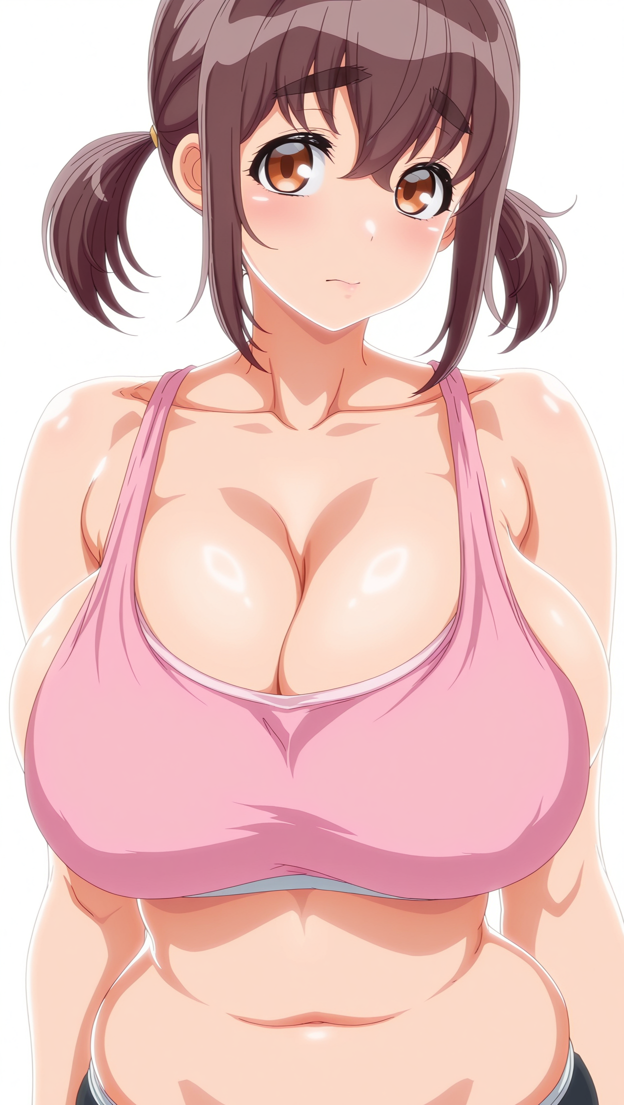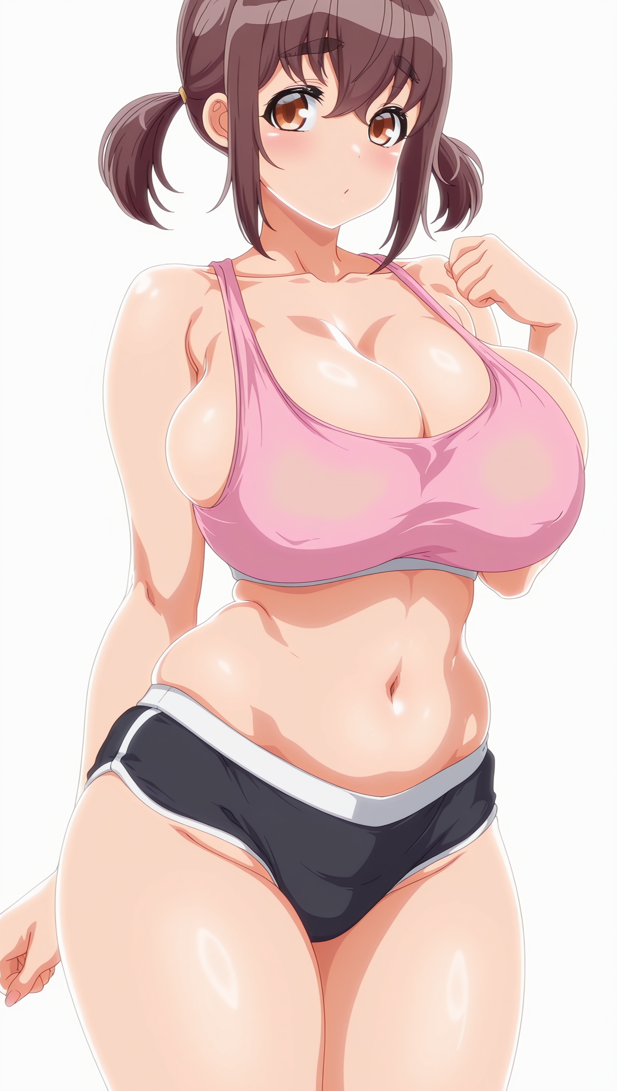 anime coloring, masterpiece, best quality, amazing quality, n4g41-s4n, 1girl, short hair, short twintails, brown hair, brown eyes, large breasts, crop top, pink top, gym shorts, black shorts, navel, midriff, solo, pose, standing, looking at viewer, from front, ((((white background, simple background))))