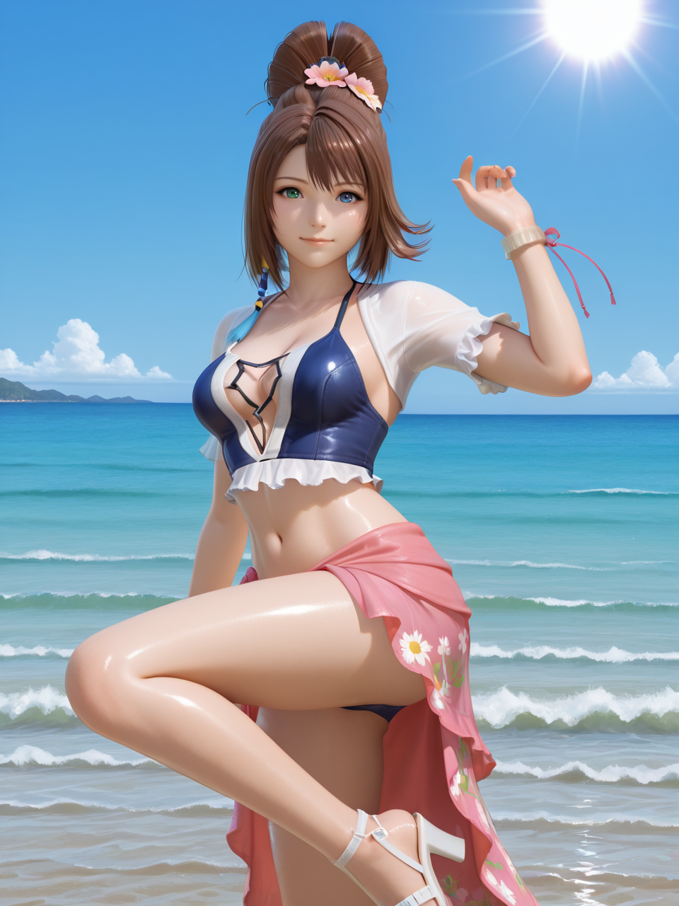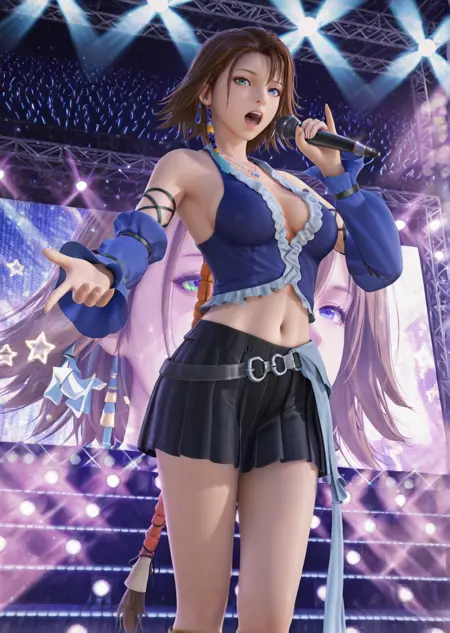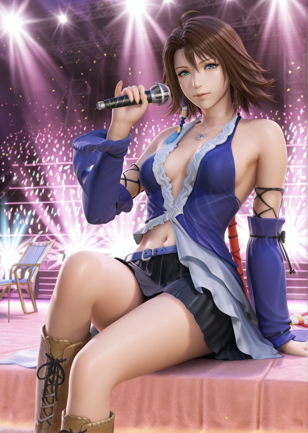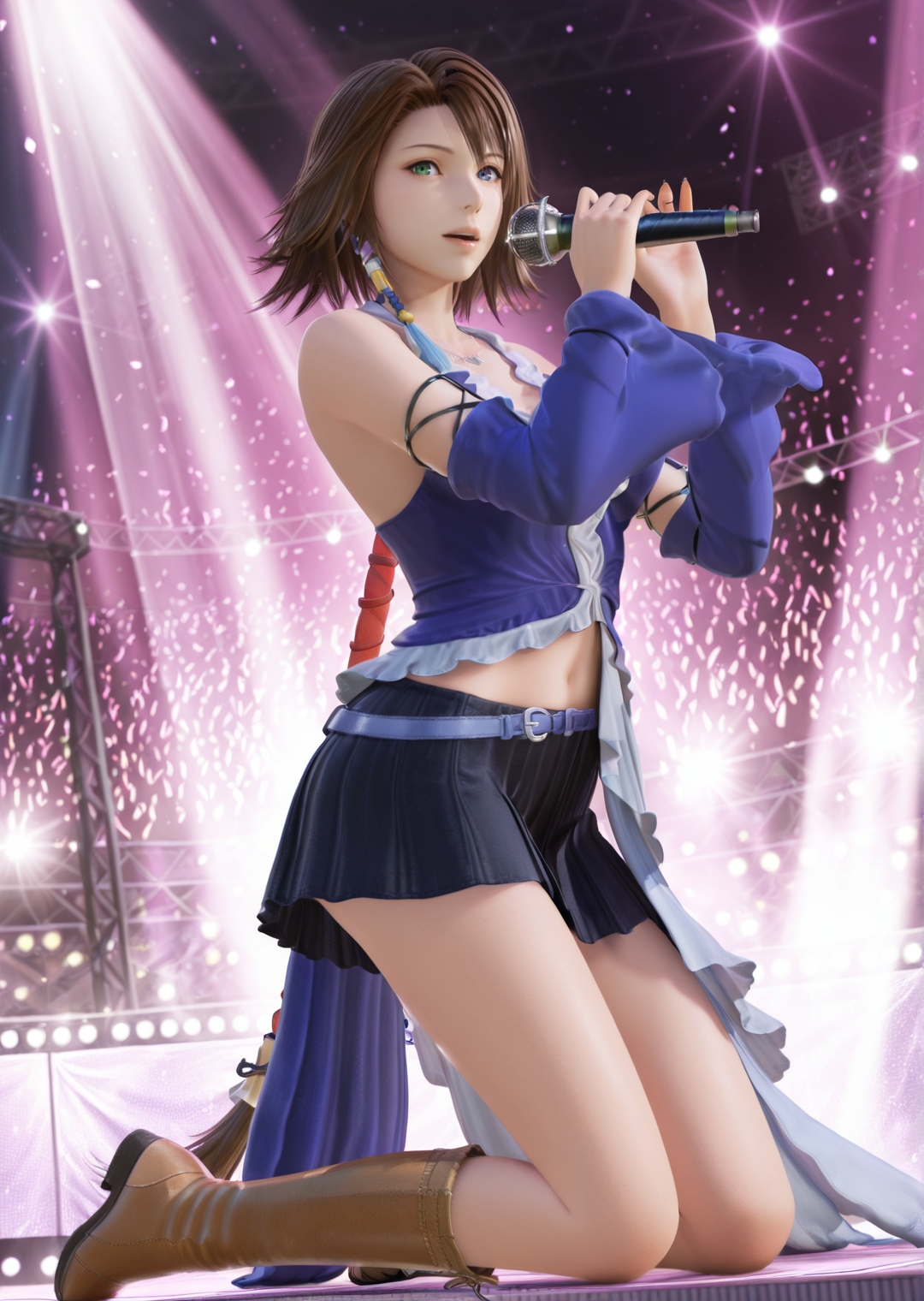 Yuna (Songstress), 1girl, solo, short hair, brown hair, long braided ponytail, hair ornament, heterochromia, green eyes, blue eyes, jewelry, necklace, detached sleeves, purple sleeves, crop top, cleavage, no bra, black skirt, brown boots, navel, midriff, holding microphone, realistic