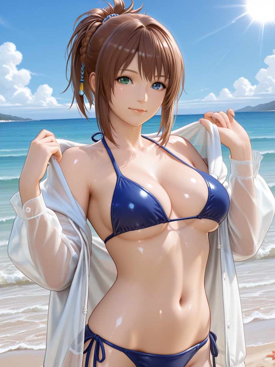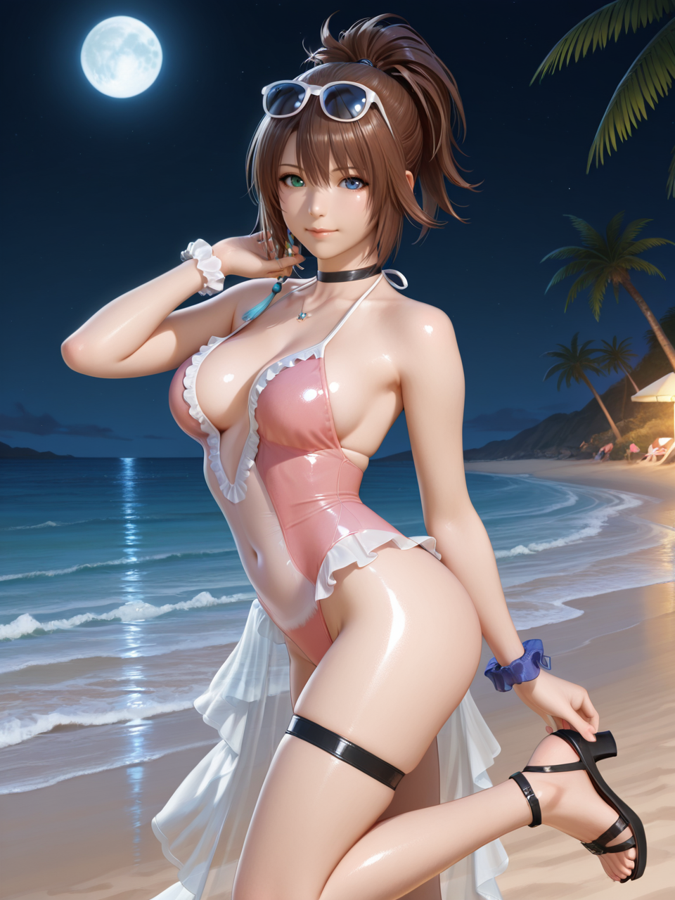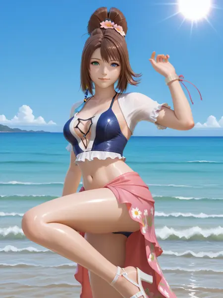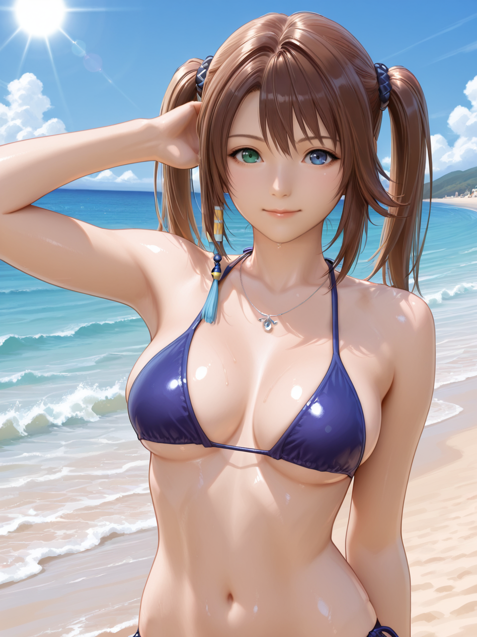 Yuna (Songstress), 1girl, solo, short hair, brown hair, long braided ponytail, hair ornament, heterochromia, green eyes, blue eyes, jewelry, necklace, detached sleeves, purple sleeves, crop top, cleavage, no bra, black skirt, brown boots, navel, midriff, holding microphone, realistic