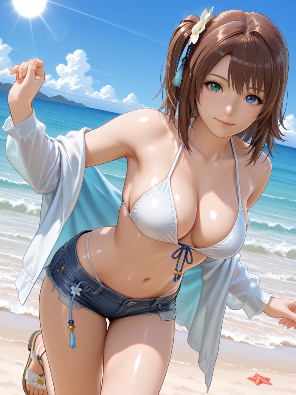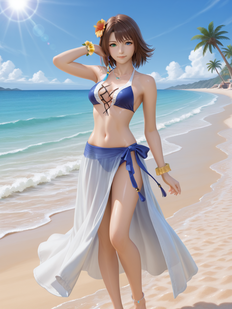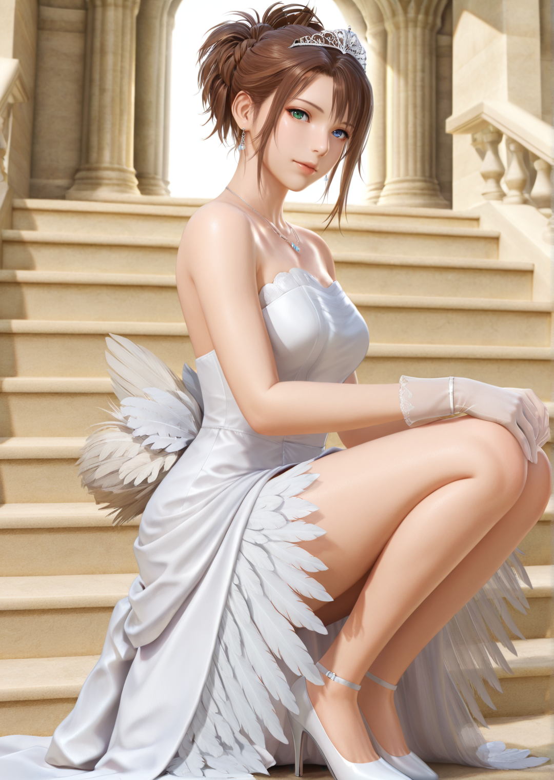 Yuna (Wedding Dress), 1girl, solo, short hair, brown hair, hair up, heterochromia, blue eyes, green eyes, jewelry, tiara, necklace, earrings, bare shoulders, feathers, feather back bow, wedding dress, white gloves, high heels, realistic