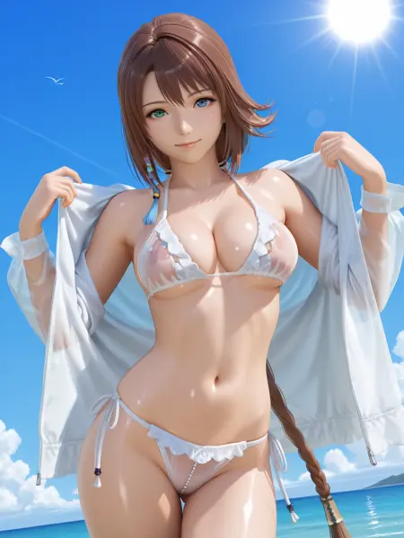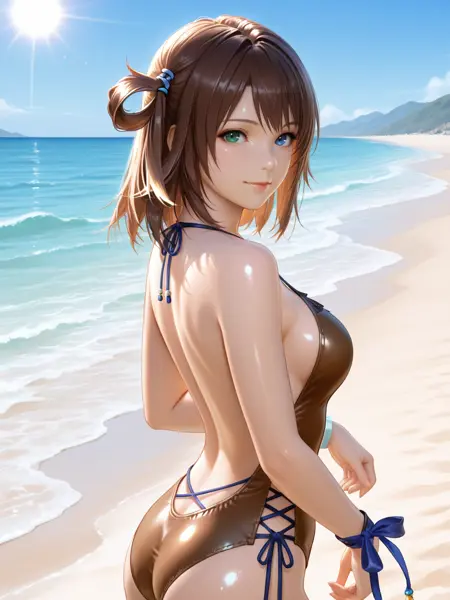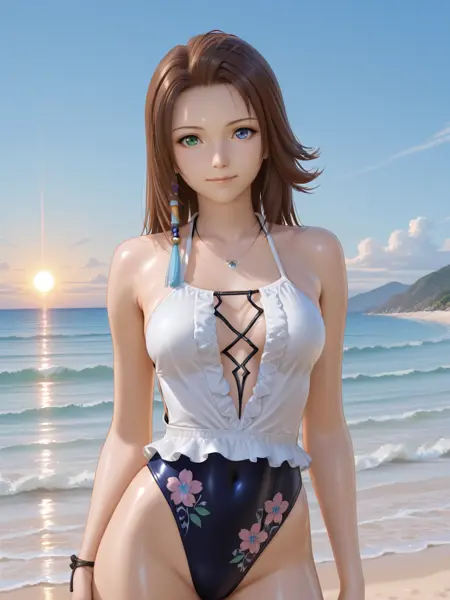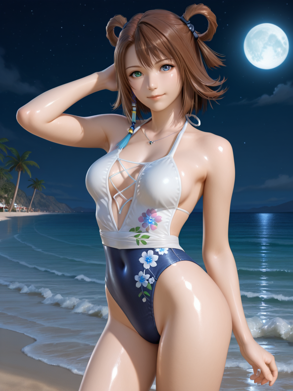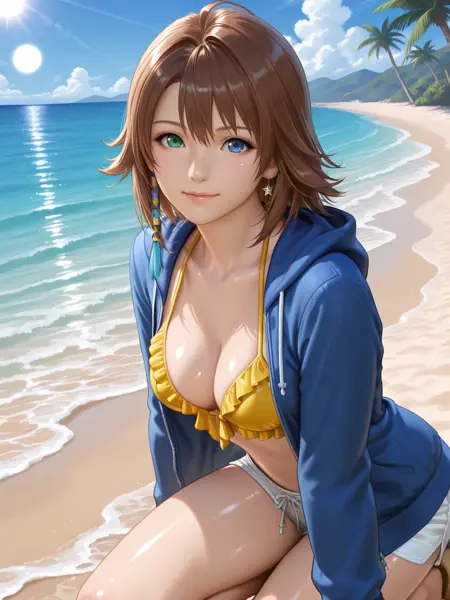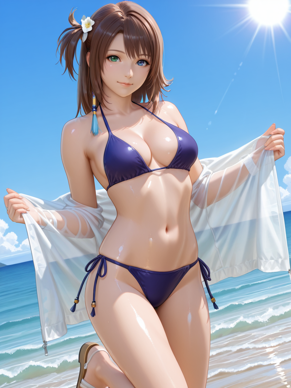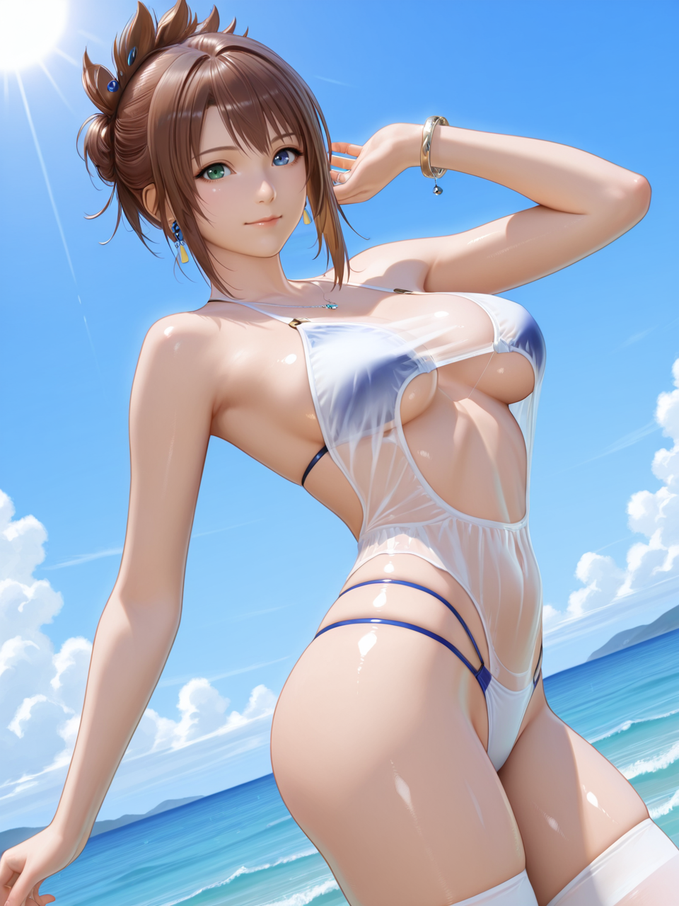 Yuna (Wedding Dress), 1girl, solo, short hair, brown hair, hair up, heterochromia, blue eyes, green eyes, jewelry, tiara, necklace, earrings, bare shoulders, feathers, feather back bow, wedding dress, white gloves, high heels, realistic