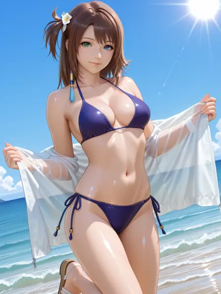 Yuna (summoner), 1girl, solo, short hair, brown hair, blue eyes, green eyes, heterochromia, hair ornament, necklace, japanese clothes, hakama skirt, purple hakama, detached sleeves