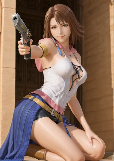 Yuna (Gunner), 1girl, solo, brown hair, pink hoodie, white top, boots, side skirt, black shorts, short hair, short shorts, medium breasts, necklace, jewelry, brown eyes, belt, realistic