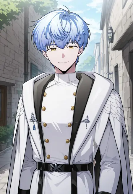 1boy, male focus, solo, yellow eyes, blue hair, black shirt, high collar, white coat, double-breasted, white gloves, white pants,