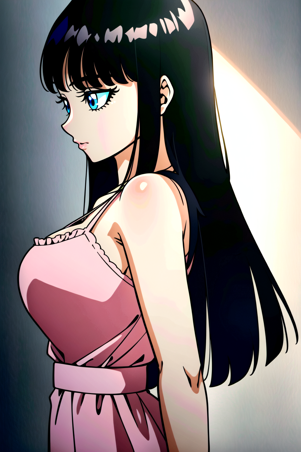 Mai, 1girl, solo, black hair, black eyes, boots, dress, smile, long hair, white background, child, belt, female child