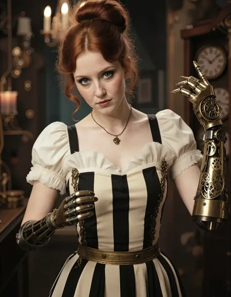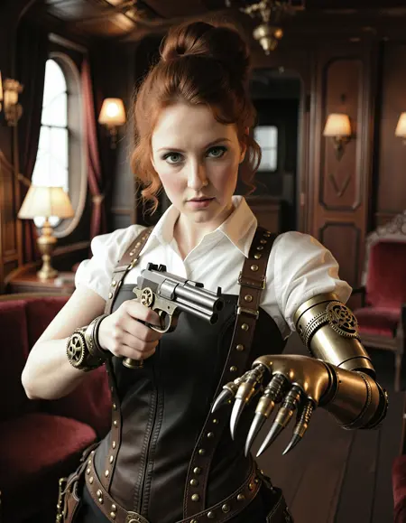 Cassandra Redwyke is a Steampunk Engineer. As a result of a workshop mishap in the past she has had to build herself a clockwork prosthetic for her right arm.